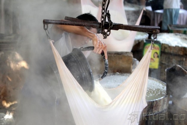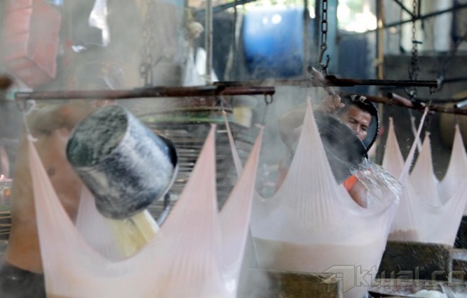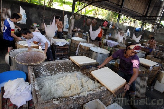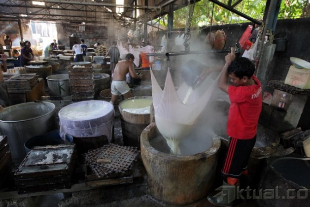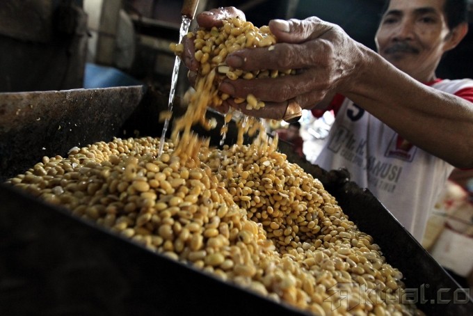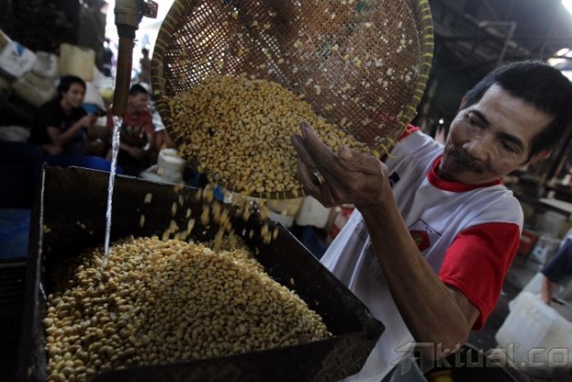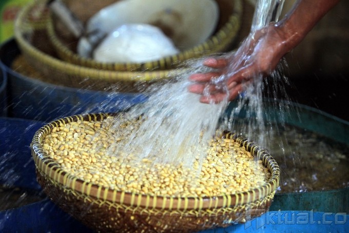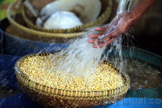 Seorang pembuat tahun mencuci kedelai untuk dijadikan tahu di pabrik tahu dikawasan Duren Tiga, Jakarta Selatan, Selasa (27/8). Imbas pelemahan nilai rupiah terhadap dolar AS menyebabkan harga kedelai melonjak menjadi Rp 9.200/Kg dari harga normal Rp 7.700-8.000/Kg. Akibatnya 17 perajin tempe dan tahu diberbagai daerah terpaksa berhenti produksi. Aktual/Tino Oktaviano