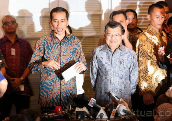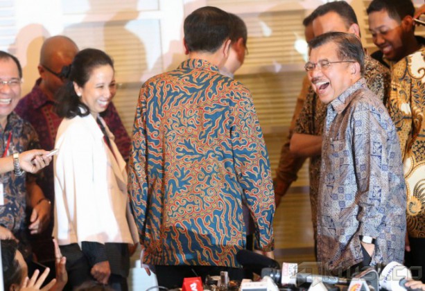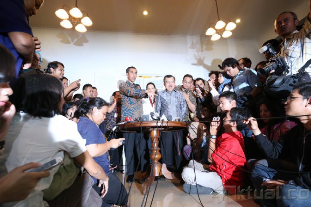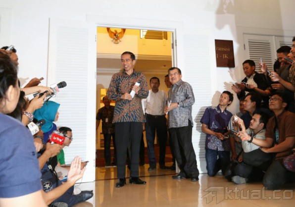 Presiden terpilih Joko Widodo bersama Jusuf Kalla resmi mengumumkan struktur kabinet pemerintahnya di Kantor Transisi, Menteng, Jakarta, Senin (15/9/2014). Jokowi-JK memutuskan untuk mempertahankan 34 kementerian yang ada. Guna memastikan berjalannya pemerintahan berjalan efektif dengan sistem presidensial. Nantinya, di 34 kementerian itu bakal diduduki oleh 18 profesional dan 16 profesional partai. Selain itu, Jokowi-JK tetap mempertahankan tiga jabatan Menteri koordinasi dalam kabinet dan memutuskan menghapus jabatan wakil menteri (wamen) di tubuh kabinetnya. AKTUAL/TINO OKTAVIANO