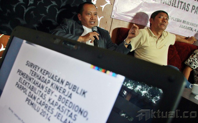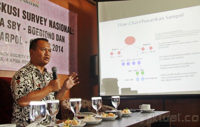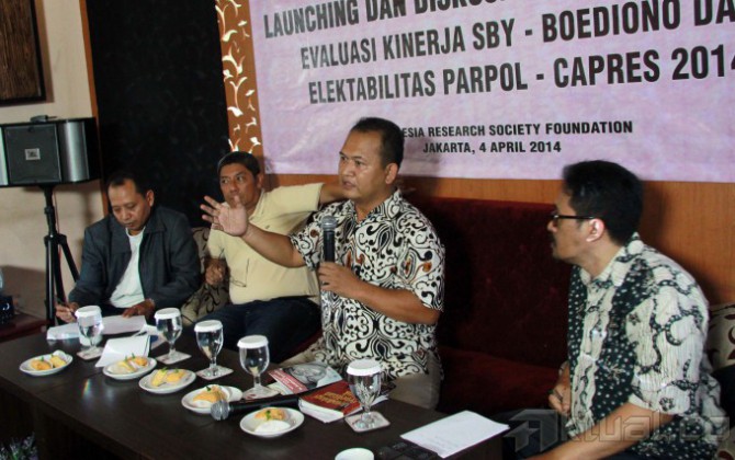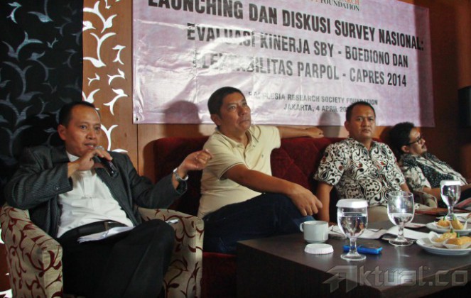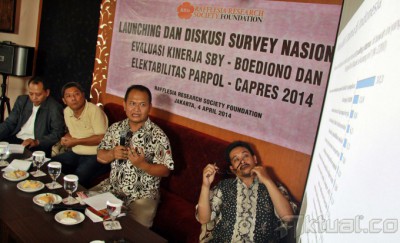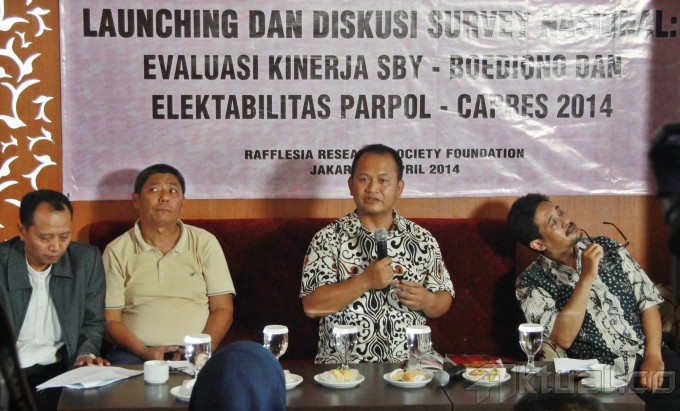 Peneliti Senior Indonesian Public Institute (IPI), Karyono Wibowo, Direktur Eksekutif Global Future Institute (GFI), Hendrajit, Peneliti Senior Raflesia Research Society Foundation (RRSF), Syaufan Rozi (kedua kanan) dan Peneliti Raflesia Research Society Foundation (RRSF), Faizal Rizki menjadi pembicara saat diskusi survei nasional: Evaluasi Kinerja Pemerintahan SBY-Boediono dan Tingkat Elektabilitas Parpol dan Capres 2014, sekaligus peluncuran RRSF di Restoran Dapur Selera, Jalan Soepomo, Jakarta Selatan, Jumat (4/4/2014). Calon Presiden dari Partai Gerindra, Prabowo Subianto tempati posisi tertinggi dalam survei yang dilakukan Raflesia Research Society Foundation (RRSf). Sebagian besar responden, memilih Prabowo Subianto sebagai Presiden 2014, dengan persentase 35,6%. Disusul kemudian Joko Widodo dengan 30,2%, Megawati 7,5%, Aburizal Bakrie 7,1%, dan Wiranto 5,5%. Aktual/Tino Oktaviano