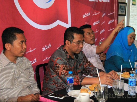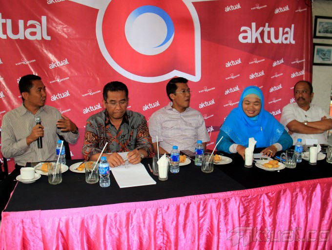 Dari kiri ke kanan, Pengamat Ekonomi Asosiasi Ekonomi Politik Indonesia (AEPI) Salamudin Daeng, Staf Ahli Menteri Keuangan Bidang Makro Ekonomi dan Keuangan Internasional Andin Hadiyanto, Anggota DPR RI Komisi IX M Misbakhun, Pengamat Ekonomi Indef Enny Sri Hartati dan Ketua Komisi Tetap Fiskal dan Moneter Kadin Adler Manurung saat diskusi Aktual Forum dengan tema “Rupiah Anjlok, Peringatan Dini Krisis Ekonomi? di warung Komando, Jakarta, Minggu (5/4/2015). Melemahnya rupiah selain faktor eksternal, juga disebabkan oleh fundamental ekonomi Indonesia yang relatif lemah dan ekonomi kita masih didominasi modal asing, konsumsi ditopang kredit konsumsi juga daya beli rendah. AKTUAL/MUNZIR