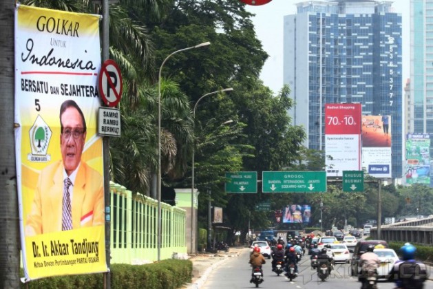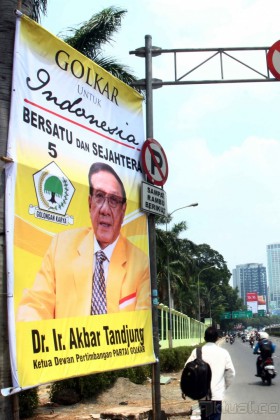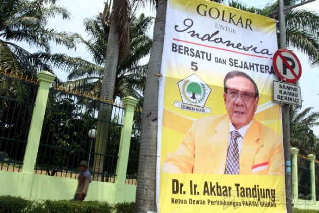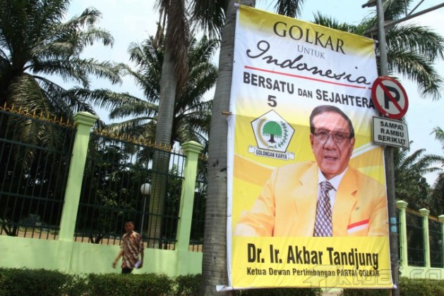 Baliho mantan Ketua Umum yang kini menjabat Ketua Dewan Pertimbangn Partai Golongan Karya (Golkar) Akbar Tandjung terpampang di ruas Jalan Gatot Subroto, depan Gedung Parlemen, Jakarta, Jum’at (11/10/2013). Akbar Tandjung disebut-sebut akan tampil menggantikan Aburizal Bakrie (Ical) sebagai Capres Partai Golkar 2014, hal ini terkait tidak ada peningkatan elektabilitas Ical dalam survei yang dilakukan sejumlah lembaga, dan makin tampaknya perpecahan faksi di tubuh Partai yang belambang Pohon Beringin tersebut. Aktual/Tino Oktaviano
