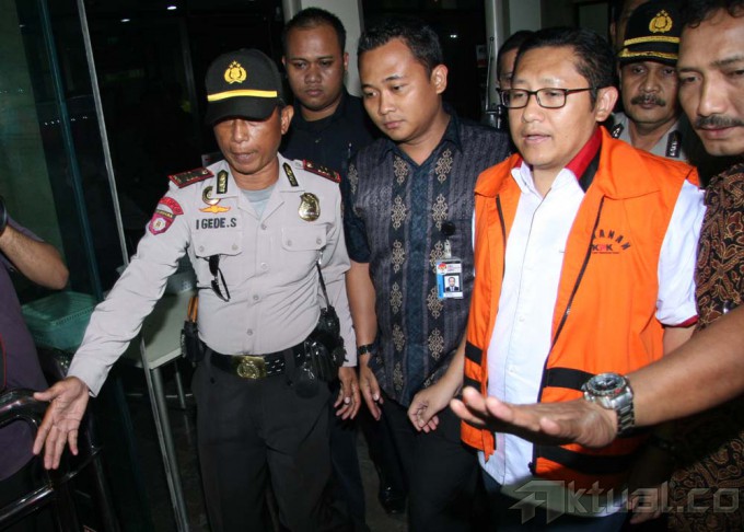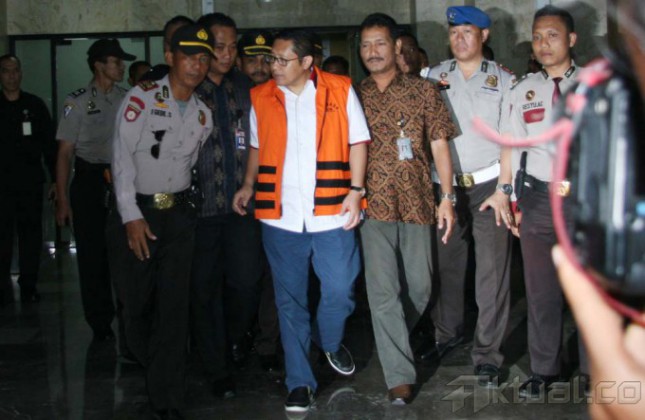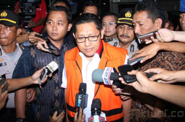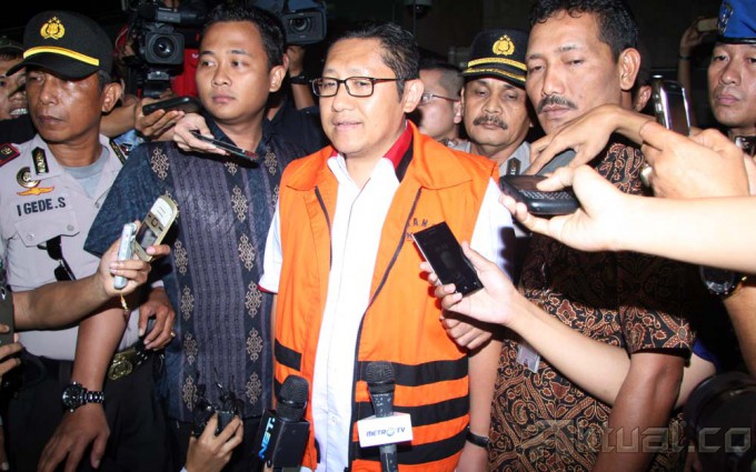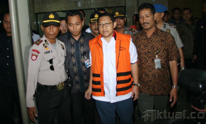 Mantan Ketua Partai Demokrat Anas Urbaningrum, mengenakan pakaian tahanan Komisi Pemberantasan Korupsi (KPK) saat keluar usai menjalani pemeriksaan di gedung KPK, Jakarta, Jumat (10/1/2014). Anas merupakan tersangka kasus dugaan penerimaan hadiah dalam proses perencanaan Hambalang atau proyek-proyek lainnya. Anas ditetapkan sebagai tersangka sejak 22 Februari 2013 lalu. Aktual/Tino Oktaviano