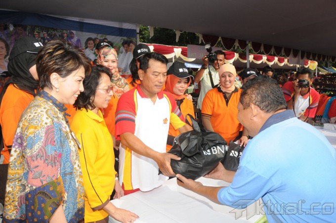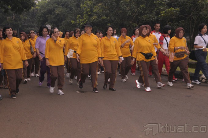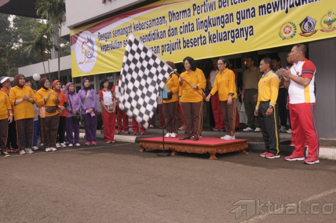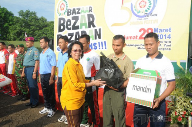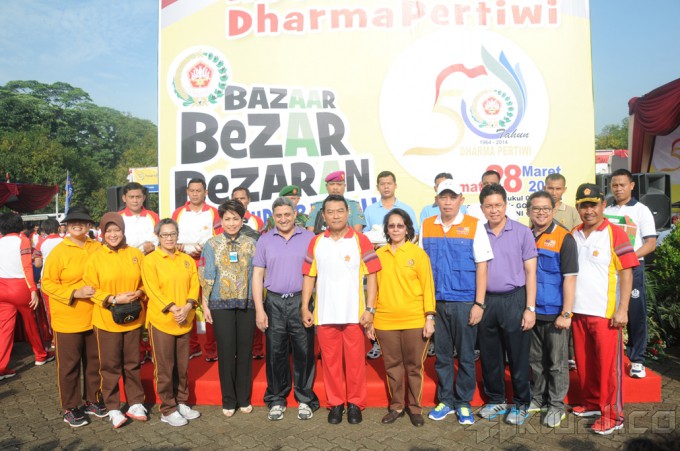 Panglima TNI Jenderal TNI Dr. Moeldoko selaku Pembina Utama Dharma Pertiwi dan Ketua Umum Dharma Pertiwi Ibu Koes Moeldoko serta para pejabat teras Mabes TNI, mengikuti kegiatan gerak jalan santai dalam rangka Hari Ulang Tahun (HUT) ke-50 Dharma Pertiwi, di Mabes TNI Cilangkap Jakarta, Jumat (28/3/2014). Gerak jalan santai diikuti sebanyak 2.000 personil dari Mabes TNI, TNI AD, TNI AL dan TNI AU serta anggota Dharma Pertiwi. Usai gerak jalan santai, dilanjutkan dengan pemberian sembilan bahan pokok secara gratis dan pembagian doorprice kepada peserta gerak jalan. Aktual/Puspen TNI