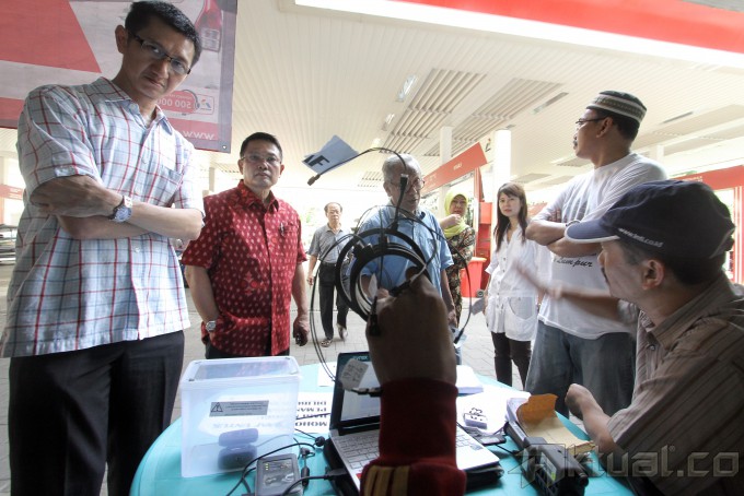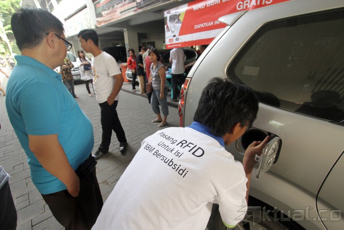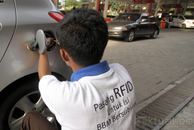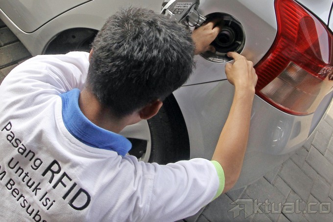 Petugas PT Pertamina (persero) memasang radio frequency identification (RFID) gratis di Stasiun Pengisian Bahan Bakar Umum (SPBU), Jalan HR Rasuna Said, Jakarta Selatan, Sabtu (30/11/2013). PT Pertamina (Persero) menargetkan pemasangan alat monitor bahan bakar minyak di Jakarta selesai pada Desember ini. sudah ada 53 SPBU di Jakarta yang melayani pemasangan RFID. Sebagaimana diberitakan sebelumnya, ternyata baru 1 persen atau sekitar 40.000 unit dari 4 juta target kendaraan di seluruh DKI Jakarta yang terpasang RFID. Aktual/Tino Oktaviano