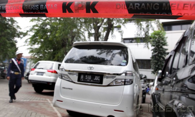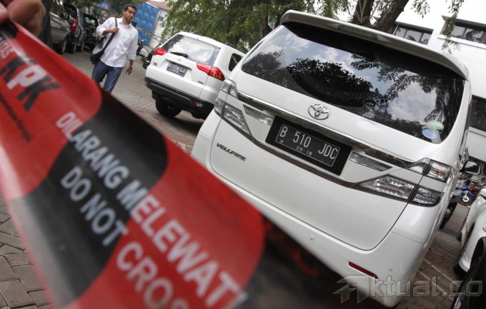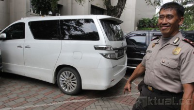 Anggota polisi melintas dekat mobil Toyota Vellfire warna putih bernopol B 510 JDC yang disita dari artis Jennifer Dunn, yang terparkir di Halaman Gedung KPK, Jakarta Selatan, Kamis (13/2/2014). KPK menyita mobil tersebut terkait kasus dugaan pencucian uang yang menjerat Tubagus Chaeri Wardana alias Wawan. Aktual/Tino Oktaviano