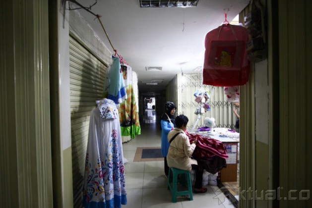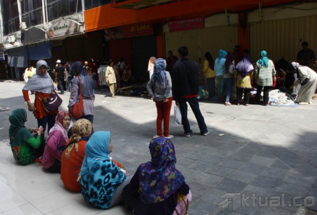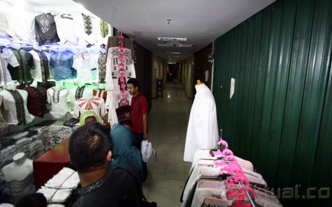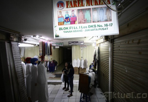 Seorang pengunjung diantara toko-toko yang masih tutup di Pasar Tanah Abang, Jakarta Pusat, Kamis (31/7/2014). Walaupun ada sebagian toko yang buka, namun suasana sepi masih terlihat di kawasan perniagaan tersebut yang kebanyakan pemilik toko masih pulang mudik. Aktual/Tino Oktaviano