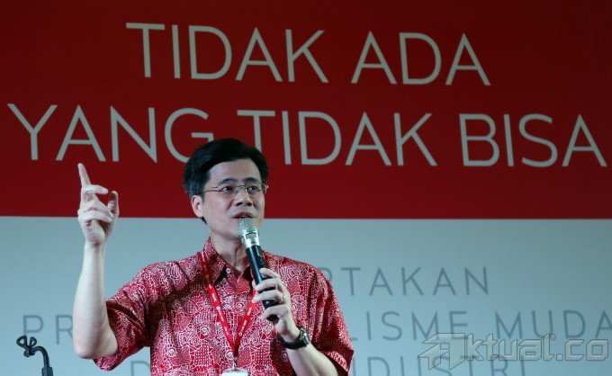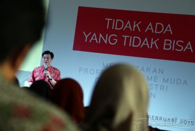 Preskom Bank OCBC NISP Pramukti Surjaudaja memberikan bekal pengetahuan dan pengalaman kepada para mahasiswa di acara campus visit Sharing knowledge dan workshop dengan tema “Menciptakan Profesionalisme Muda Dalam Industri Perbankan” di Universitas Indonesia, Depok, Jawa Barat, Selasa (24/2/2015). Pembekalan ini untuk mempersiapkan mahasiswa terjun menghadapi persaingan, peluang dan tantangan yang ketat dalam dunia pekerjaan khususnya perbankan diera Masyarakat Ekonomi ASEAN (MEA), Bank OCBC NISP melakukan campus visit Sharing knowledge dan workshop dengan tema “Menciptakan Profesionalisme Muda Dalam Industri Perbankan” yang diikuti 125 mahasiswa peserta dari berbagai jurusan. AKTUAL/TINO OKTAVIANO