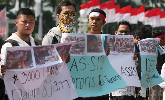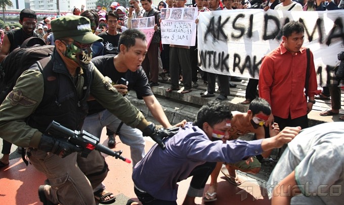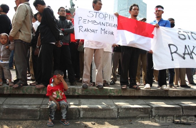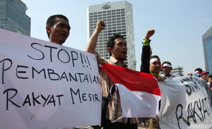 Massa dari Komunitas Kemanusian Peduli Rakyat Mesir menggelar aksi solidaritas “Selamatkan Mesir, Stop pembantaian Rakyat Sipil” di Bunderan Hotel Indonesia, Jakarta, Kamis (15/8). Mereka mendesak PBB agar bersikap terhadap peristiwa pembantain rakyat sipil Mesir dan mengutuk segala tindakan kekerasan terhadap rakyat sipil diseluruh dunia. Aktual/Tino Oktaviano