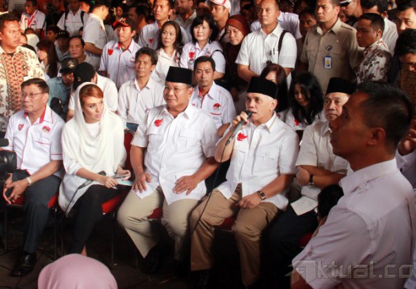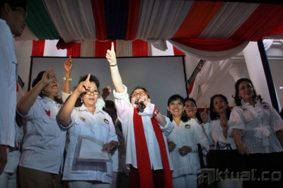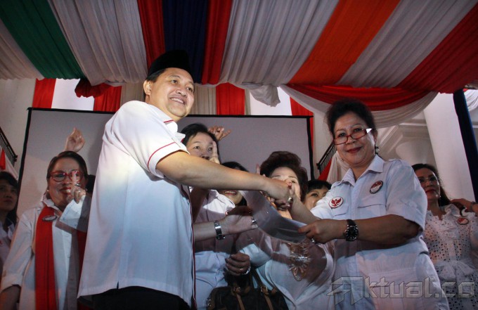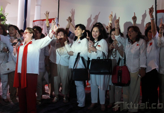 Simpatisan yang mengatas namakan Perkumpulan Perempuan Bhineka Tunggal Ika, menggelar dukungan kepada pasangan Prabowo-Hatta di rumah Polonia, Jakarta, Sabtu (5/7/2014). Perkumpulan Perempuan Bhineka Tunggal Ika juga akan bergerak dengan melakukan beberapa langkah strategis untuk memenangkan pasangan nomor urut 1 diantaranya mengkonsolidasikan serta membangun jaringan untuk menggerakkan pemilih pemula di seluruh Indonesia serta masyarakat luas pada umumnya. Aktual/Tino Oktaviano
