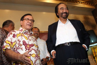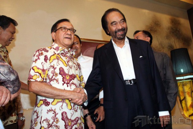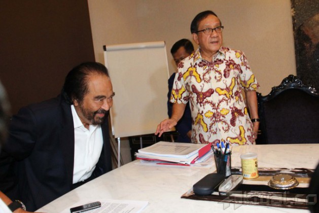 Ketua Dewan Pertimbangan Partai Golkar Akbar Tandjung (kiri) menemui Ketua Umum Partai Nasdem Surya Paloh (kanan), di kantor DPP Partai NasDem, Jakarta, Selasa (13/5/2014). Akbar mengaku pertemuan tersebut sebagai langkah awal penjajakan koalisi sebelum diputuskan dalam Rapat Pimpinan Nasional (Rapimnas) Partai Golkar pada pertengahan Mei 2014 mendatang. Aktual/Tino Oktaviano