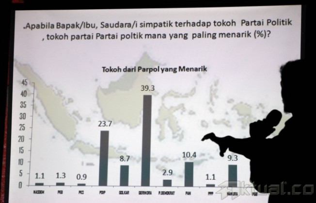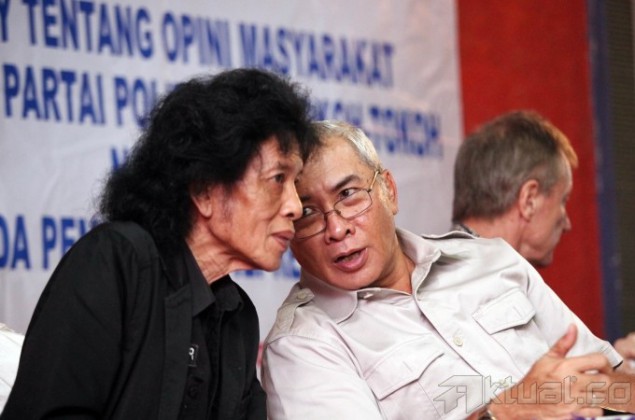 Mantan Anggota Komisi Pemilihan Umum (KPU), Mulyana W Kusumah (kiri) dan Pengamat Ekonomi Kemal Syamsudin berdialog saat menjadi pembicara survey Elektabilitas Parpol dan Capres Pemilu 2014 di Jakarta, Kamis (5/9). Hasil survey INES menyebutkan dari 28 tokoh nasional, Prabowo menempati urutan tertinggi dalam hal tokoh yang memiliki gaya kepemimpinan yang diinginkan masyarakat, disusul Joko Widodo, Hatta Rajasa dan Megawati. Aktual/Tino Oktaviano