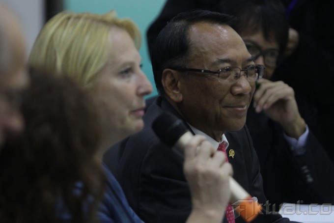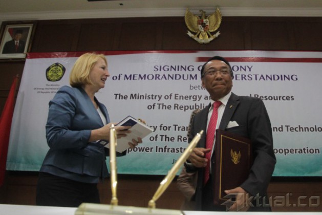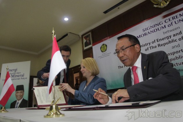 Menteri Energi dan Sumber Daya Mineral (ESDM) Jero Wacik (kanan) bersama Menteri Transportasi, Inovasi dan Teknologi Austria Doris Bures (kiri) saat penandatanganan nota kesepahaman kerjasama teknologi infrastruktur PLTA di Jakarta, Senin (5/5/2014). Kerjasama tersebut demi mengembangkan energi terbarukan PLTA terutama pada hydro power untuk meningkatkan pertumbuhan ekonomi dan pembangunan antar kedua negara. Aktual/Tino Oktaviano