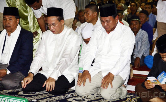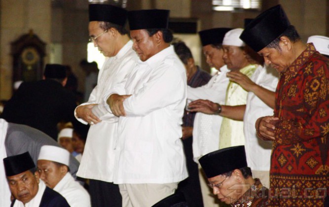 Capres Partai Gerindra Prabowo Subianto dan Ketua Umum PPP Suryadharma Ali salat Jumat bareng di Masjid Istiqlal, Jakarta Pusat, Jumat (16/4/2014). Prabowo dan SDA kompak mengenakan kemeja putih. Aktual/Ist