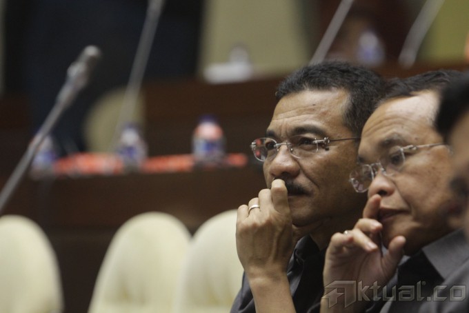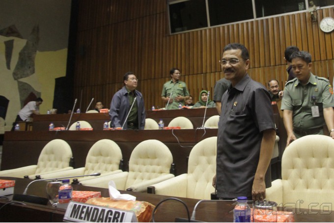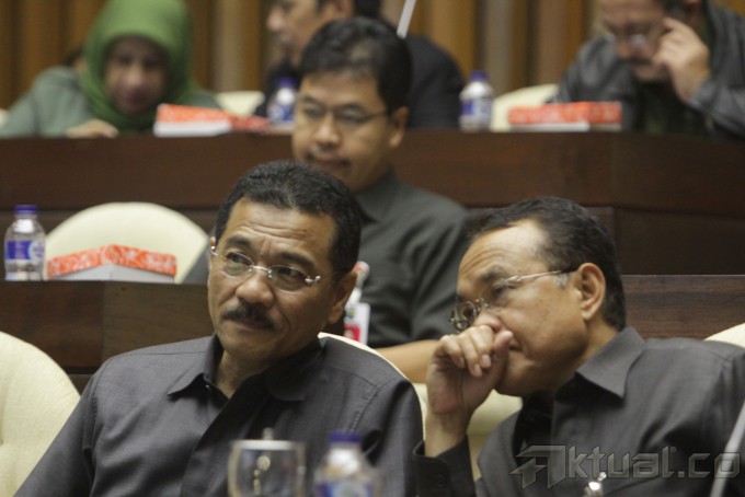 Mendagri Gamawan Fauzi (kiri) berbincang dengan Dirjen Otonomi Daerah Djohermansyah Djohan sebelum mengikuti rapat kerja dengan Komisi II DPR di Kompleks Parlemen Senayan, Jakarta, Senin (3/2/2014). Rapat kerja tersebut membahas soal pengesahan jadwal dan mekanisme pembahasan 65 RUU tentang Pembentukan Daerah Otonom Baru. Aktual/Tino Oktaviano