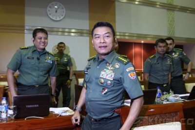 KSAD Jenderal TNI Moeldoko tersenyum sebelum menyampaikan misi dan visi saat mengikuti Uji Kelayakan dan Kepatutan calon Panglima TNI di Komisi I DPR, Gedung Parlemen, Jakarta, Rabu (21/8). Presiden Susilo Bambang Yudhoyono menunjuk Moeldoko sebagai calon tunggal Panglima TNI, untuk menggantikan Laksamana Agus Suhartono yang akan pensiun pada akhir Agustus 2013. Aktual/Tino Oktaviano