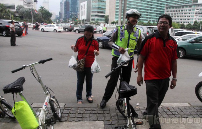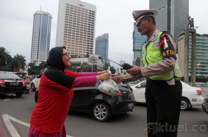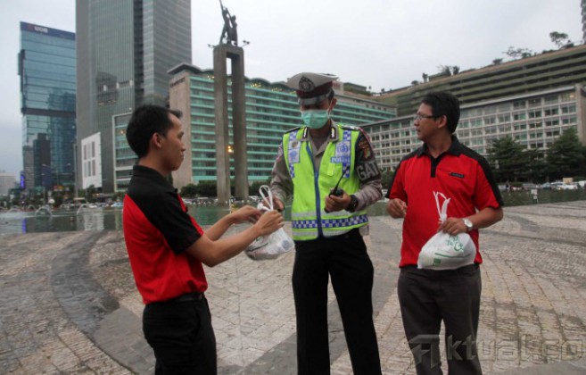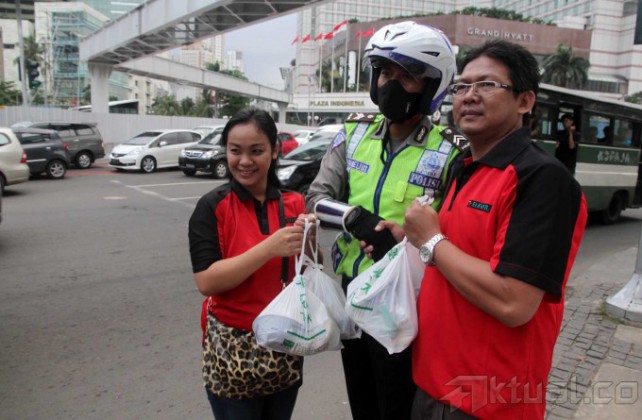 Seorang karyawan 7-Eleven memberikan takjil kepada polisi lalu lintas di kawasan Bundaran Hotel Indonesia, Jakarta Pusat, Sabtu (19/7/2014). Mengapresiasi kerja aparat polisi, 7-Eleven menggelar peduli Polisi, dengan membagi-bagikan takjil dan makanan berbuka puasa yang sedang bertugas di berbagai lokasi di Jabodetabek. Aktual/Tino Oktaviano