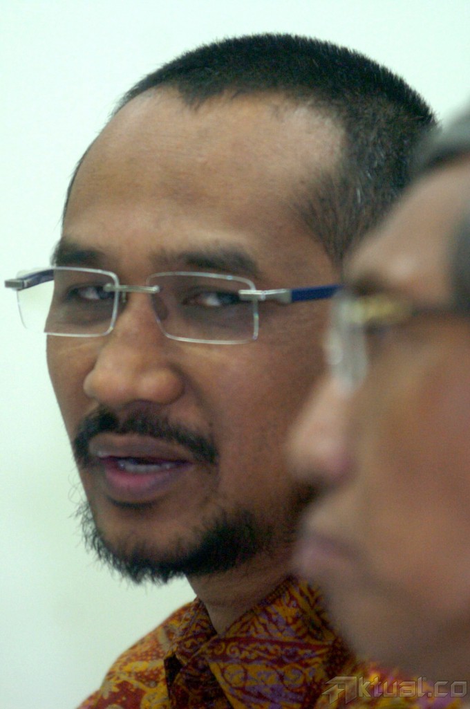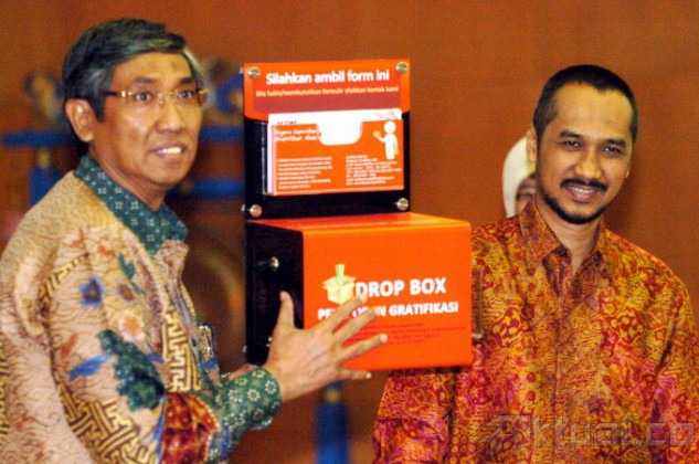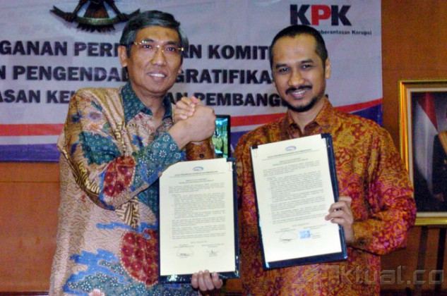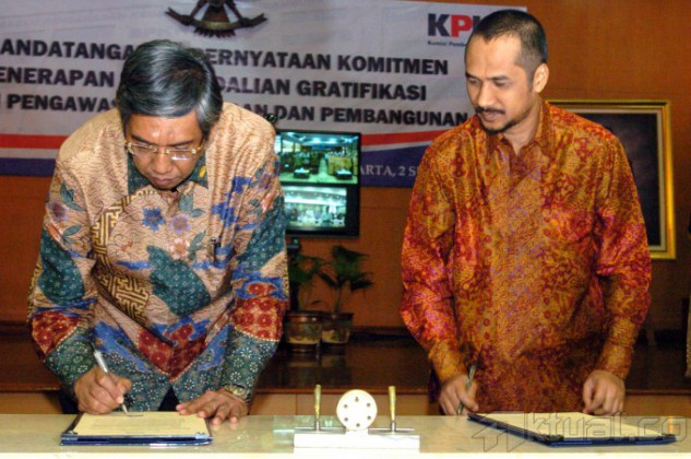 Ketua Komisi Pemberantasan Korupsi (KPK) Abraham Samad (kanan) dan Kepala Badan Pengawasan Keuangan dan Pembangunan (BPKP) Mardiasmo melakukan penandatanganan Pernyataan Komitmen Program Pengendalian Gratifikasi di lingkungan BPKP di Gedung BPKP Pusat, Jakarta, Selasa (2/9/2014). Penandatanganan dilakukan sebagai komitmen BPKP untuk “membunuh” korupsi tepat pada awal mulanya korupsi berasal, yaitu adanya gratifikasi dan dimulai dari lingkungan terdekat, yaitu keluarga. Aktual/Tino Oktaviano