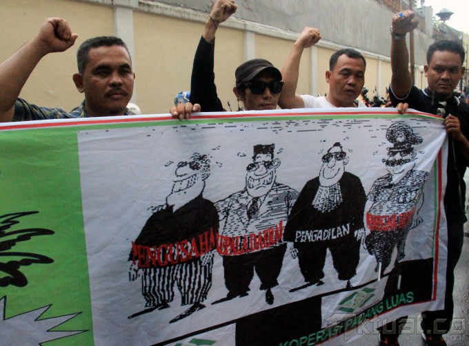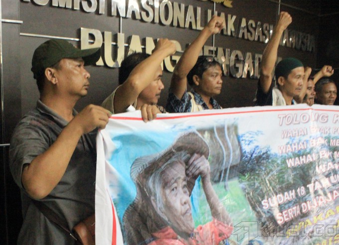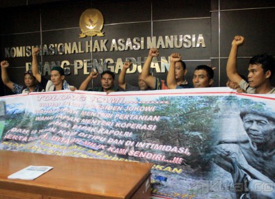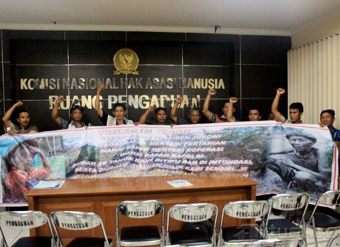 Puluhan petani Palalawan Riau mendatangi Komnas HAM, Jakarta Pusat, Rabu (25/3/2015). Para petani melaporkan penindasan dan kriminalisasikan oleh pihak PT Peputra Supra Jaya. AKTUAL/MUNZIR