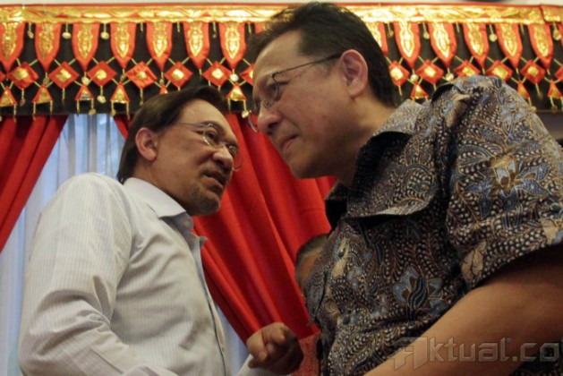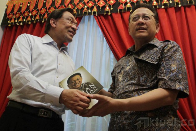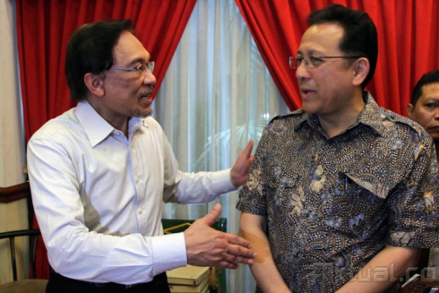 Mantan Wakil Perdana Menteri yang juga tokoh oposisi Malaysia Anwar Ibrahim (kiri) menerima buku dari Ketua DPD Irman Gusman (kanan) usai mengadakan pertemuan di Jakarta, Selasa (5/11/2013). Pertemuan itu salah satunya membahas kondisi demokrasi di kedua negara terutama di Indonesia yang tak lama lagi akan melaksanakan pemilihan umum. Aktual/Tino Oktaviano