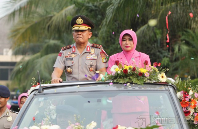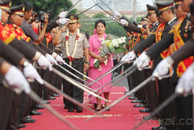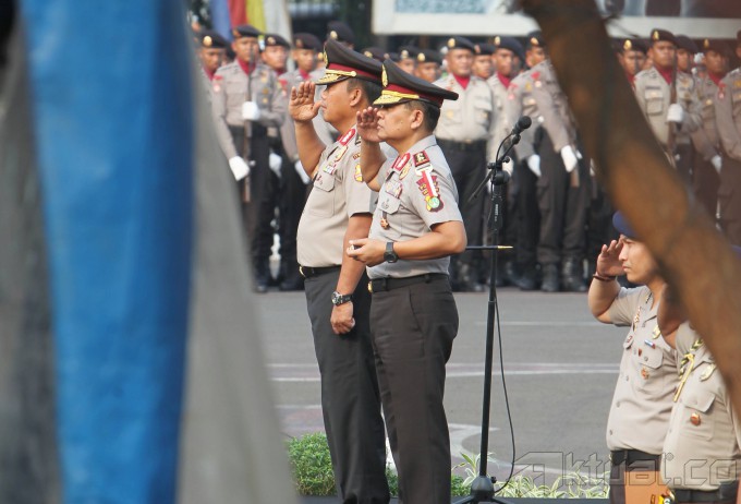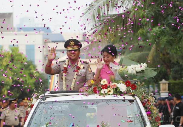 Kapolda Metro Jaya lama Irjen Pol Dwi Priyatno (kiri) bersalaman dengan Kapolda baru Irjen Pol Unggung Cahyono (kanan) saat upacara perpisahan dan penyambutan di Mapolda Metro Jaya, Jumat (5/9/2014). Aktual/Tino Oktaviano