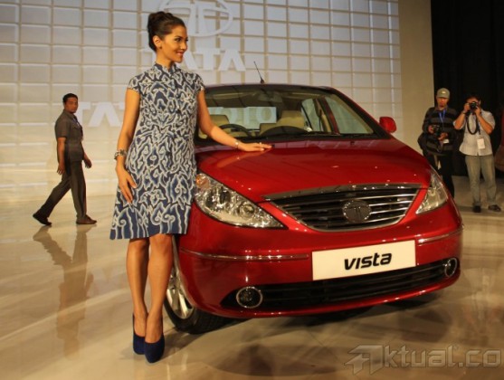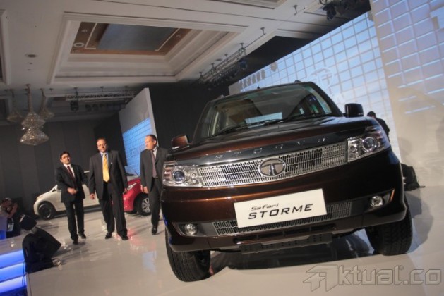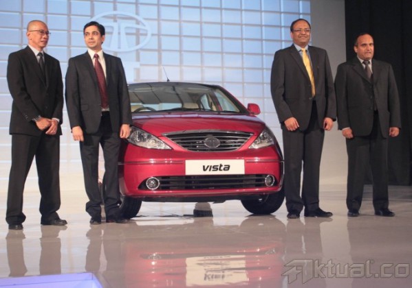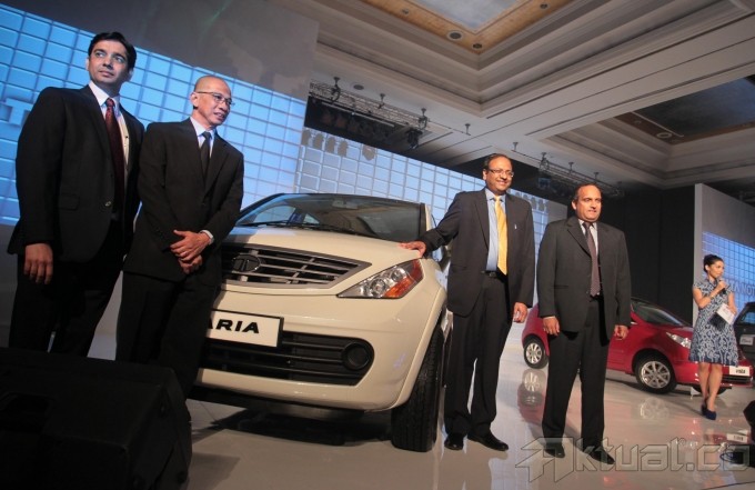 Presiden Direktur PT Tata Motors Indonesia (TMI) Biswadev Sengupta (3 kiri) didampingi (ki-ka) HR&Legal; Director TMI Achmad Djauhari, Director&Distribution; Head TMI Pankaj Jain, International Business Unit Head for Passenger Vihicle Johny Omen berpose di depan tiga varian produk baru Tata Motors yakni Tata Aria, Tata Vista dan Tata Safari Storme yang resmi diluncurkan di Jakarta, Selasa (10/9/2013). Dalam acara peluncuran ini, TMI juga memperkenalkan 15 diler hingga Maret 2014 dan menyediakan 40 bengkel resmi di seluruh kota Indonesia. Aktual/Tino Oktaviano