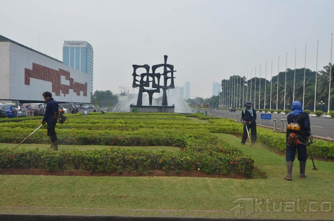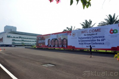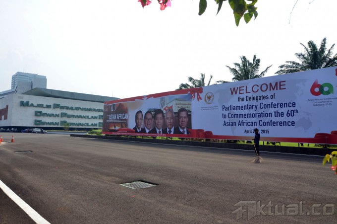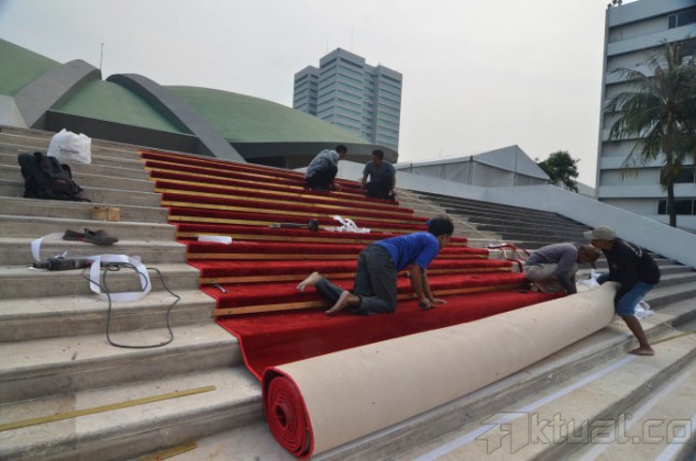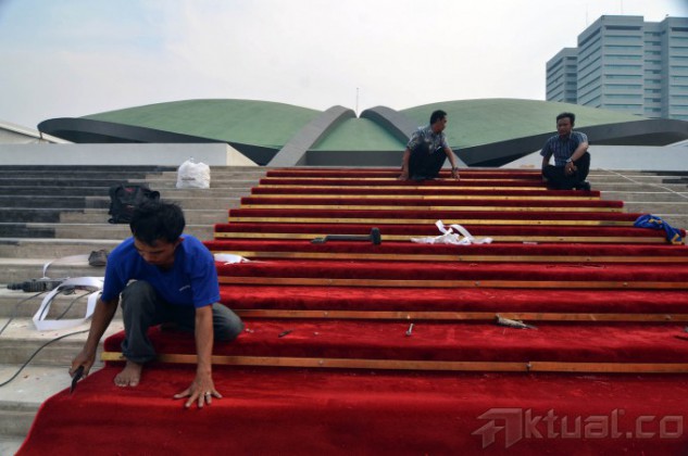 Sejumlah Pekerja mengerjakan dekorasi dalam persiapan jelang Forum Parlemen Asia-Afrika Gedung Nusantara IV Kompleks Parlemen Senayan, Jakarta Selatan, Selasa (21/4/2015). Dewan Perwakilan Rakyat (DPR) akan menjadi tuan rumah ajang Asia Afrika Parliamentary Conference atau Konferensi Parlemen Asia Afrika pada Kamis (23/4/2015), yang merupakan salah satu rangkaian acara Konferensi Asia Afrika. AKTUAL/JUNAIDI MAHBUB
