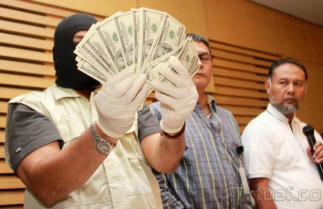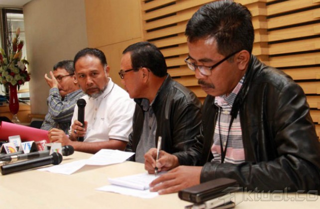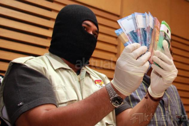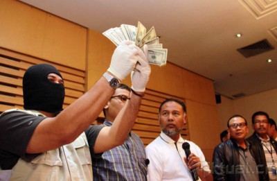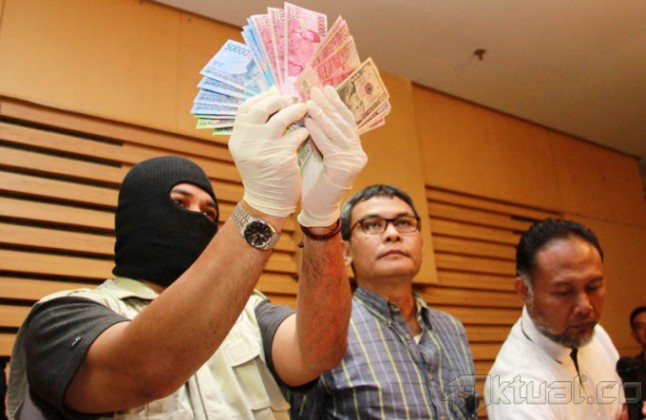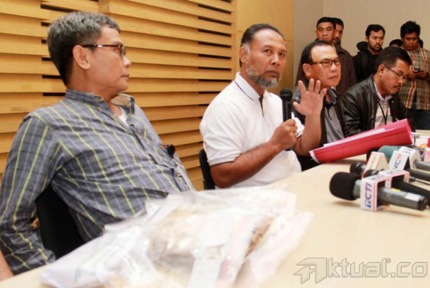 Wakil Ketua KPK Bambang Widjojanto (ketiga kanan) didampingi Jubir KPK Johan Budi (keempat kanan), Jamintel Kejagung Ajat Sudrajat (kedua kanan) dan Kapuspenkum Kejagung Setia Untung Arimuladi (kanan) memberi keterangan mengenai Operasi Tangkap Tangan (OTT) kasus dugaan suap terkait pengurusan perkara pemalsuan dokumen sertifikat tanah di wilayah Lombok Tengah di gedung KPK, Jakarta, Minggu (15/12/2013). KPK menangkap dua orang berinisial SUB dan LAR dalam Operasi Tangkap Tangan (OTT) dan barang bukti uang pecahan Dollar US$100 sebanyak 164 dengan total US$ 16.400 setara dengan Rp190 juta dan uang rupiah dengan total Rp23 juta. Aktual/Tino Oktaviano