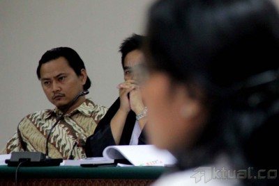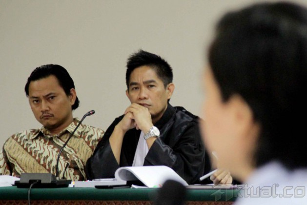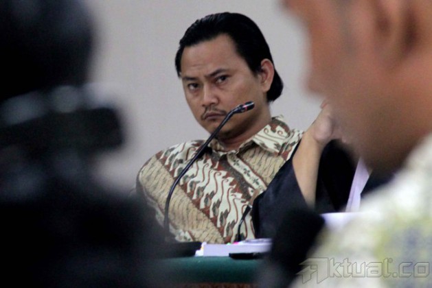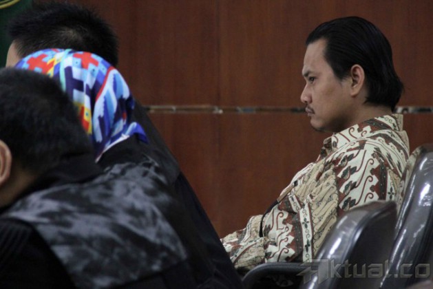 Terdakwa Direktur Utama PT Rifuel, Riefan Afrian (tengah) ketika menjalani sidang lanjutan kasus videotron dengan agenda pemeriksaan saksi di Pengadilan Tindak Pidana Korupsi (Tipikor), Jakarta, Kamis (30/10/2014). Jaksa penuntut umum menghadirkan lima orang saksi dalam kasus videotron yang melibatkan Riefan Afrian disebut yang merugikan negara sebesar Rp 5,3 miliar pada proyek pengadaan videotron di Kementerian Koperasi dan Usaha Kecil dan Menengah (UKM). AKTUAL/JUNAIDI MAHBUB