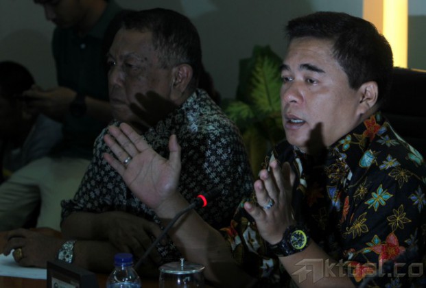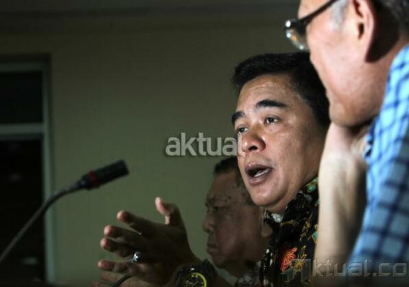 Ketua Umum Dewan Pimpinan Nasional (Depinas) SOKSI Ade Komarudin (tengah), Sekjen SOKSI Laurence Siburian (kanan) dan Ketua Depinas SOKSI Saut Tobing (kiri) saat jumpa pers di Gedung Parlemen, Jakarta, Jumat (2/5/2014). SOKSI tetap solid mendukung pencapresan Aburizal Bakrie (ARB) dari Partai Golkar sebelum ada keputusan Rapimnas Partai Golkar. Aktual/Tino Oktaviano