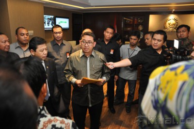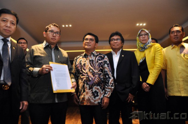 Wakil Ketua DPR RI Fadli Zon (tengah) bersama Ketua DPR RI Setya Novanto (kedua kiri) memberikan keterangan kepada sejumlah awak media seputar usulan Hak Angket kepada MenhuHAM di Ruang Tamu DPR RI, Senayan, Jakarta, Rabu (25/3/2015). Usulan Hak Angket dari KMP ini untuk segera mengagendakan pengambilan keputusan Sidang Paripurna atas penggunaan Hak Angket untuk pemerintah dan MenhuHAM Yasonna Laoly terkait konflik Golkar. AKTUAL/JUNAIDI MAHBUB