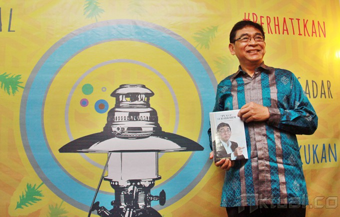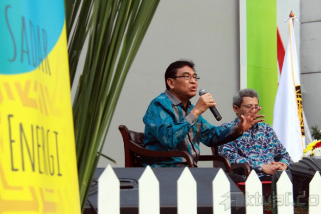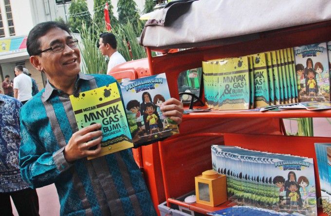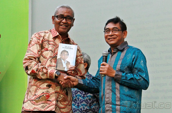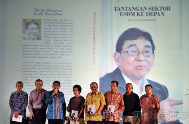 Wakil Menteri Energi dan Sumber Daya Mineral (ESDM) Susilo Siswoutomo (kanan) menyerahkan buku karyanya “Puasa Subsidi BBM” kepada Wakil Menteri Perindustrian Alex SW Retraubun (kiri) saat Festival Sadar Energi di kementrian ESDM, Jakarta, Sabtu (11/10/2014). Buku berjudul “Puasa Subsidi BBM” karya Wamen ESDM Susilo Siswoutomo itu antara lain berisi mengenai ide-ide pemanfaatan energi baru dan terbarukan serta mengupas upaya-upaya renegosiasi kontrak karya dan Perjanjian Karya Pengusahaan Pertambangan Batubara. AKTUAL/TINO OKTAVIANO