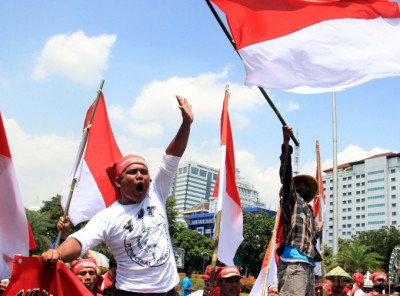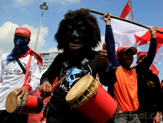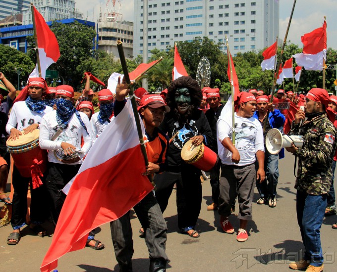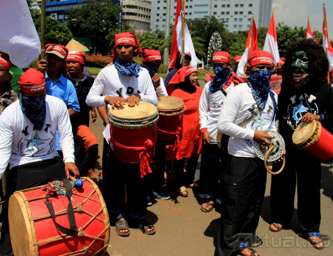 Beberapa warga Ujung Genteng Sukabumi yang tergabung dalam Tim Perjuangan Hak Masyarakat (TPHM) melakukan aksi menolak keberadaan bandara di depan Istana Negara, Jakarta, Selasa (31/3/2015). Mereka menolak keberadaan landasan udara (Lanud) Angkatan Udara (AU) Atang Senjaya diatas lahan seluas 85 hektar yang terletak di pantai Desa Ujung Genteng. Alasannya adalah terdapat hak atas tanah-tanah masyarakat yang sudah memiliki Sertifikat Hak Milik (SHM). AKTUAL/MUNZIR