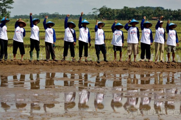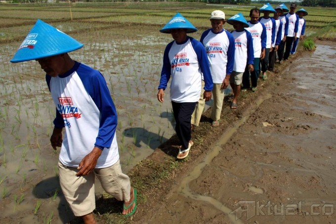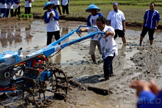 Ketua DPD PAN Banyumas Ahmad Syaeful Hadi saat membajak sawahseusai acara penyerahan secara simbolis traktor kepada petani di DesaKarangjati, kecamatan kemranjen, Banyumas Jawa tengah, Rabu(29/5). Sebagai Wujud aksi nyata, Partai Amanat Nasional (PAN)mengadakan kegiatan untuk mendukung kemandirian para petani dalamprogram aksi nyata untuk petani. Aktual/Stringer