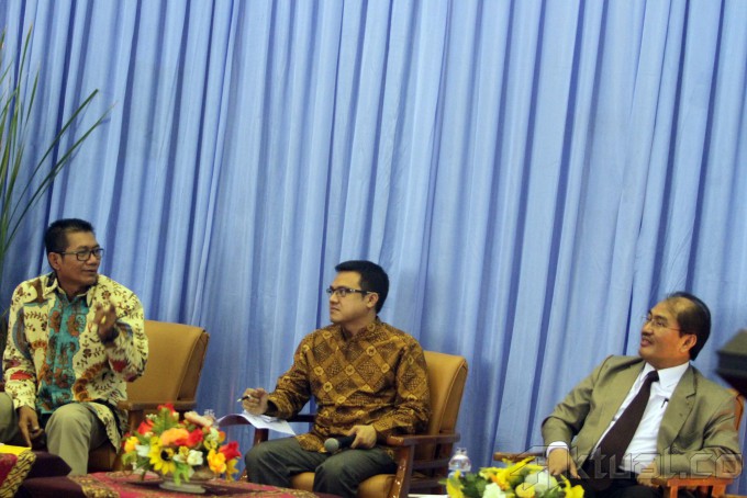 Ketua Komisi II DPR yang juga Penulis Buku Agun Gunandjar Sudarsa (kedua kiri) bersama (dari kiri) : Pengamat Politik Yudi Latif, Pengamat Politik LIPI Firman Noor, Mantan Ketua MK Jimly Assiddiqie, dan Mantan ketua KNPI Aulia Rahman usai diskusi bedah buku yang bertema “Membangun Optimisme Menuju Indonesia Sejahtera 2020”, di Gedung Parlemen Senayan, Jakarta, Rabu (20/11/2013). Agun meluncurkan tiga buku sekaligus yaitu, Membangun Indonesia Sejahtera, Pancasila Sebagai Rumah Bersama, dan Hidup Sukses dengan Lima Jari, Buku-buku yang merupakan buah pemikirannya dalam upaya membangun nilai-nilai kebangsaan yang dikaitkan dengan Pancasila sebagai dasar negara dan falsafah bangsa, sebagai visi Indonesia masa depan. Aktual/Tino Oktaviano