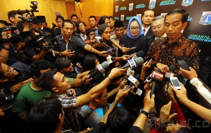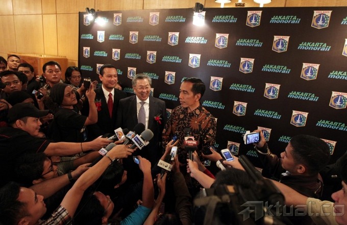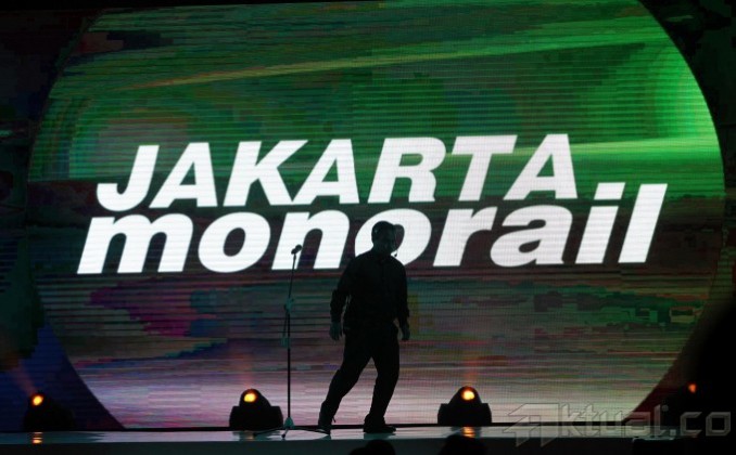 Tampak seorang penyanyi saat Peluncuran Logo Jakarta Monorail di Jakarta, Rabu (16/10/2013) malam. Logo JET merupakan hasil karya Fachrur Rozy yang memenangkan sayembara logo yang dilakukan oleh PT Jakarta Monorail, logo JET digambarkan oleh 3 balok berbentuk L terbalik, logo ini didominasi oleh warna hijau sebagai perwakilan dari unsur eco dalam kepanjangan JET (Jakarta Eco Transport). Aktual/Tino Oktaviano