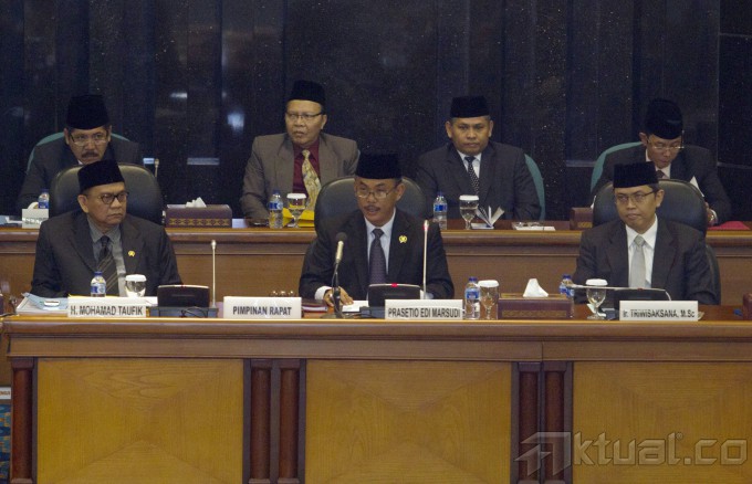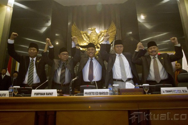 Ketua DPRD DKI Jakarta Prasetyo Edi Marsudi (tengah) bersama Wakil Ketua Abraham Lunggana (kiri), Muhammad Taufik (kedua kiri), Triwisaksana (kedua kanan) dan Ferrial Sofyan (kanan) mengangkat tangan usai memimpin rapat paripurna di Jakarta, Kamis (26/2). Pada rapat itu seluruh fraksi menyetujui usulan hak angket terhadap Gubernur DKI Jakarta Basuki T Purnama. ANTARA FOTO/Vitalis Yogi Trisna