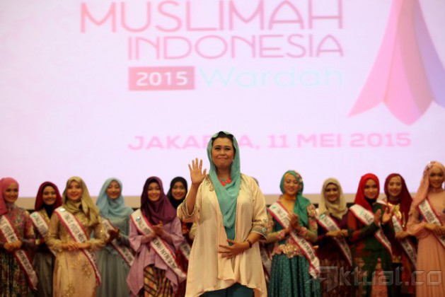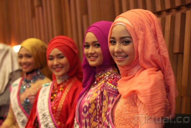 Sejumlah peserta Puteri Muslimah Indonesia 2015 hadir dalam konfrensi pers Jelang Malam Puncak Puteri Muslimah Indonesia 2015 di Jakarta, Senin (11/5). Ajang kontes kecantikan yang diikuti oleh 25 peserta dari seluruh Indonesia tersebut akan berlangsung di Emtek city, Daan Mogot, Jakarta, Rabu (13/5). ANTARA FOTO/Muhammad Adimaja