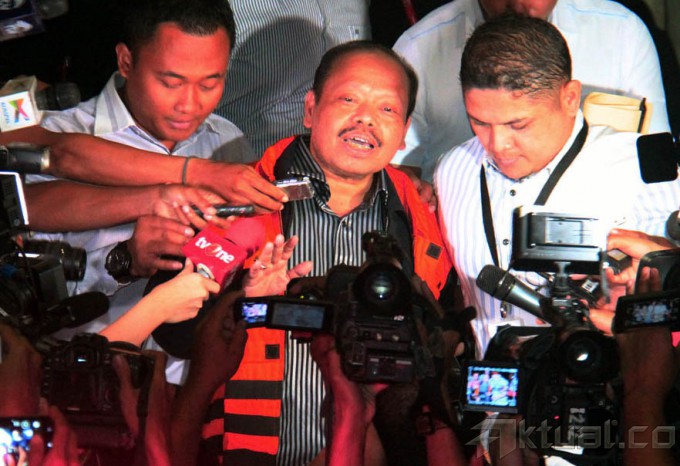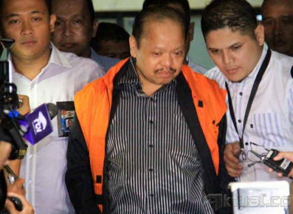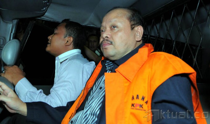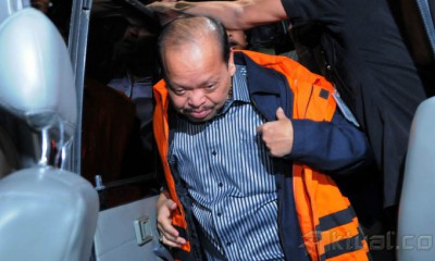 Mantan Ketua Komisi VII DPR yang juga politisi Partai Demokrat Sutan Bathoegana menggunakan rompi tanahan Komisi Pemberantasan Korupsi (KPK) saat memasuki mobil tahanan di Gedung KPK, Jakarta, Senin (2/2/2015). Sutan ditahan terkait kasus korupsi perubahan Anggaran Pendapatan Belanja Negara (APBN) tahun 2013 Kementrian ESDM. AKTUAL/MUNZIR