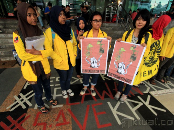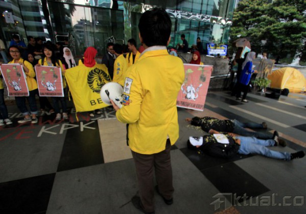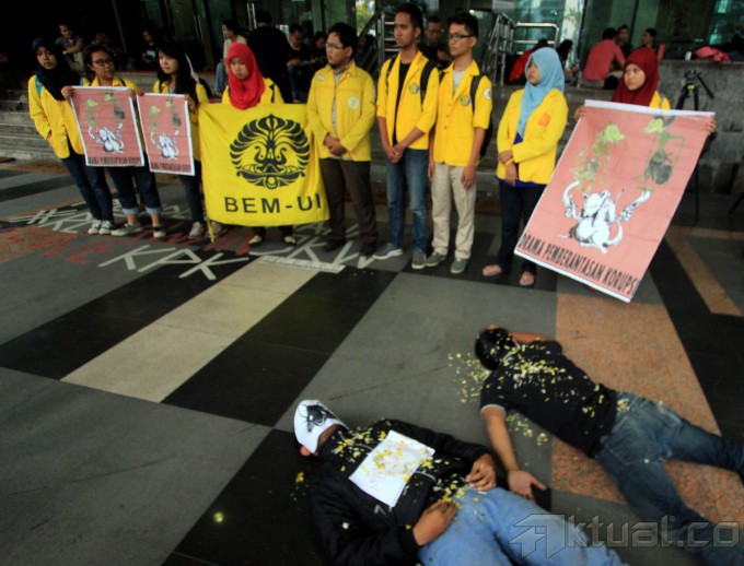 Mahasiswa yang tergabung dalam Badan Eksekutif Mahasiswa Universitas Indoneesia (BEM UI) melakukan aksi di gedung halaman Komisi Pemberantasan Korupsi (KPK), Jalan HR Rasuna Said, Jakarta Selatan, Kamis (5/3/2015). BEM UI menuntut Plt Pimpinan KPK agar kasus Komjen Pol Budi Gunawan tidak dilimpahkan ke Kejaksaan Agung. AKTUAL/MUNZIR