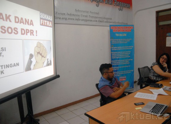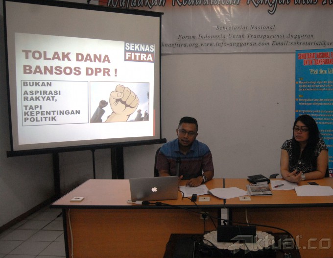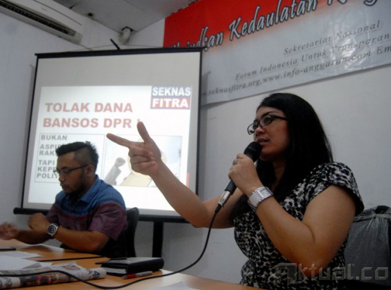 Sekjen Forum Indonesia Untuk Transparansi Anggaran (Fitra) Yenny Sucipto (kanan) didampingi Manager Apvokasi Fitra, Apung Widadi (kiri) saat menggelar siaran Pers di terkait tolak bansos DPR di Jakarta, Rabu (25/3/2015). Fitra mengkritisi wacana pemberian dana aspirasi atau dana bansos yang diperuntukan bagi membangun Daerah Pilihan (Dapil) pada masing-masing daerah di Indonesia. Dana ini akan menghabikan Anggaran Pendapatan dan Belanja Negara (APBN) senilai Rp 5,6 Triliun per tahun. AKTUAL/MUNZIR