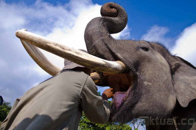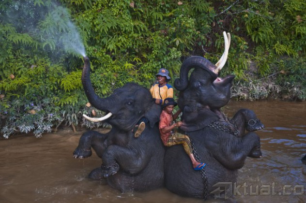 Sejumlah mahout atau pawang melatih gajah Sumatera di Pusat Latihan Gajah Siak-Riau, Sabtu (16/5). Balai Besar Konservasi Sumber Daya Alam Riau mulai serius mengembangkan potensi Gajah Sumatera (elaphas maximus sumatranus) yang merupakan satwa endemik di Riau, sebagai daya tarik pariwisata. ANTARA FOTO/FB Anggoro
