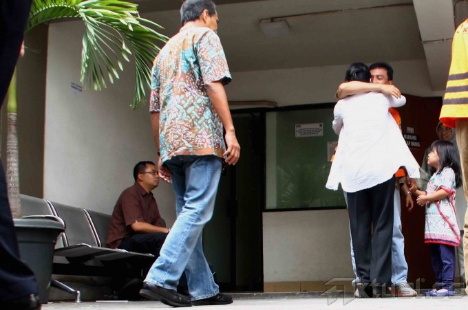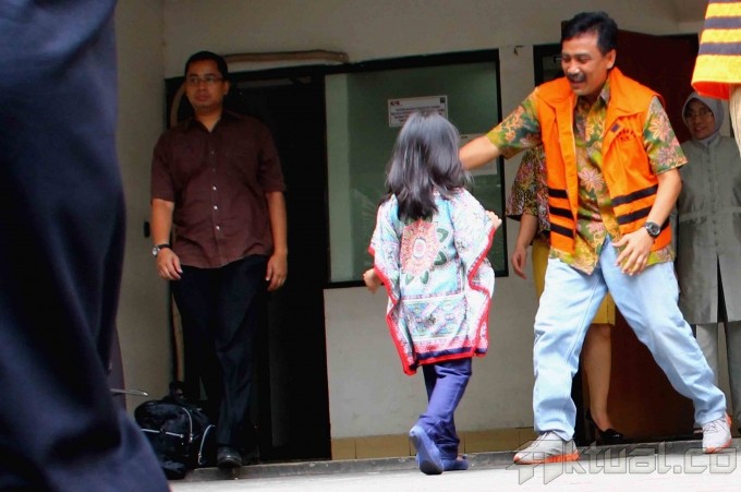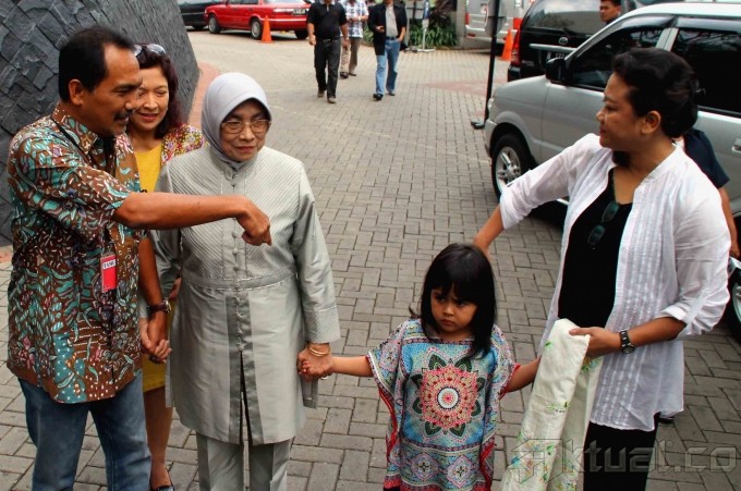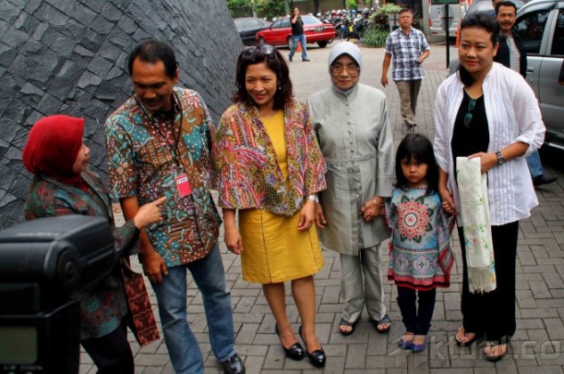 Rizal Mallarangeng (kiri) bersama Ibunya Andi Asni Patoppoi (tengah), Istri Andi Mallarangeng Vitri Cahyaningsih (kanan) dan anaknya jalan menuju ruang tahanan ketika menjenguk tersangka korupsi pembangunan proyek Pusat Pendidikan, Pelatihan dan Sekolah Olahraga Nasional (P3SON) Hambalang Andi Mallarangeng (AM) di rutan KPK, Jakarta, Senin (21/10/2013). Kunjungan tersebut merupakan yang pertama kalinya sejak AM ditahan KPK pada Kamis (17/10/2013). Aktual/Oke Dwi Atmaja