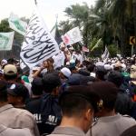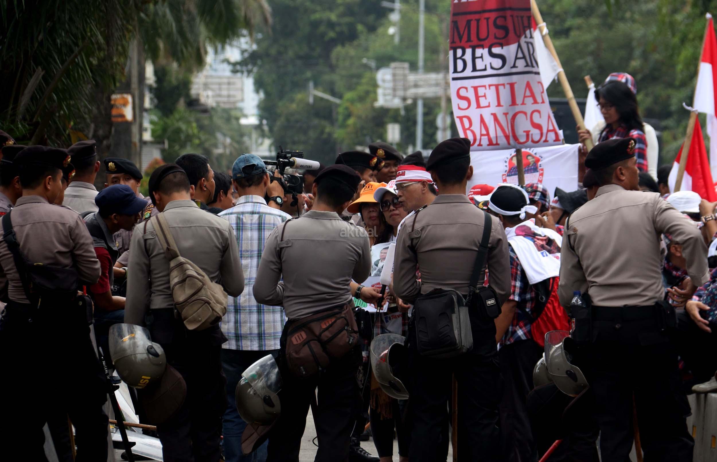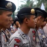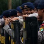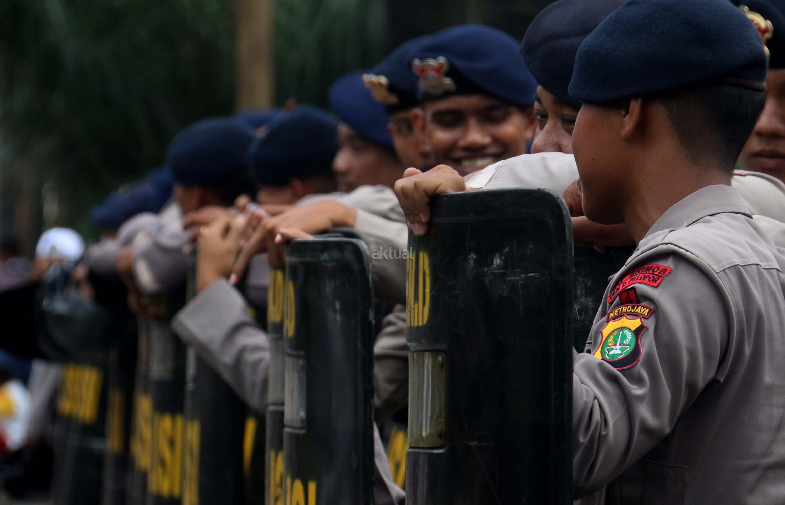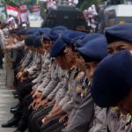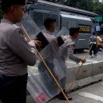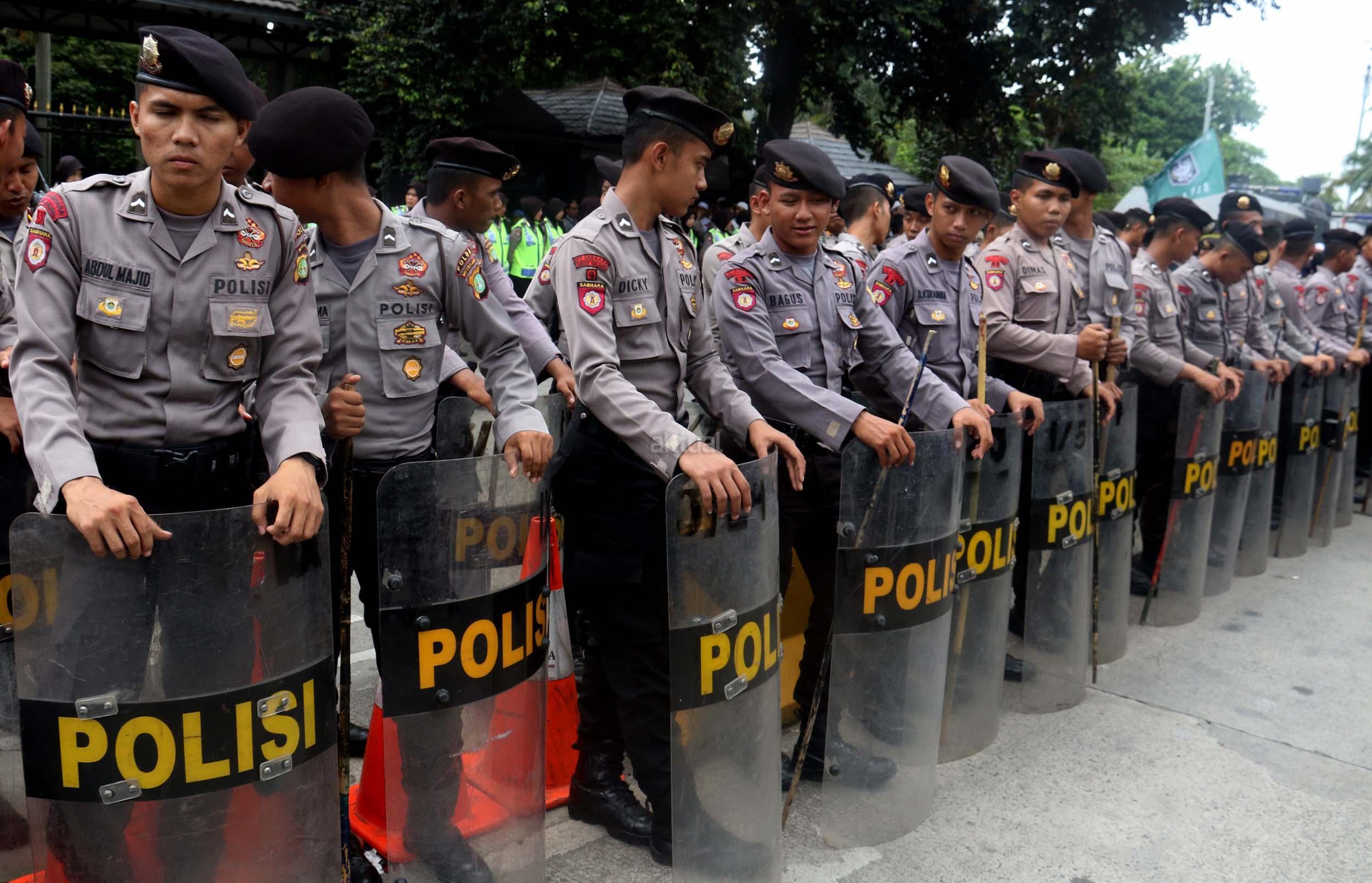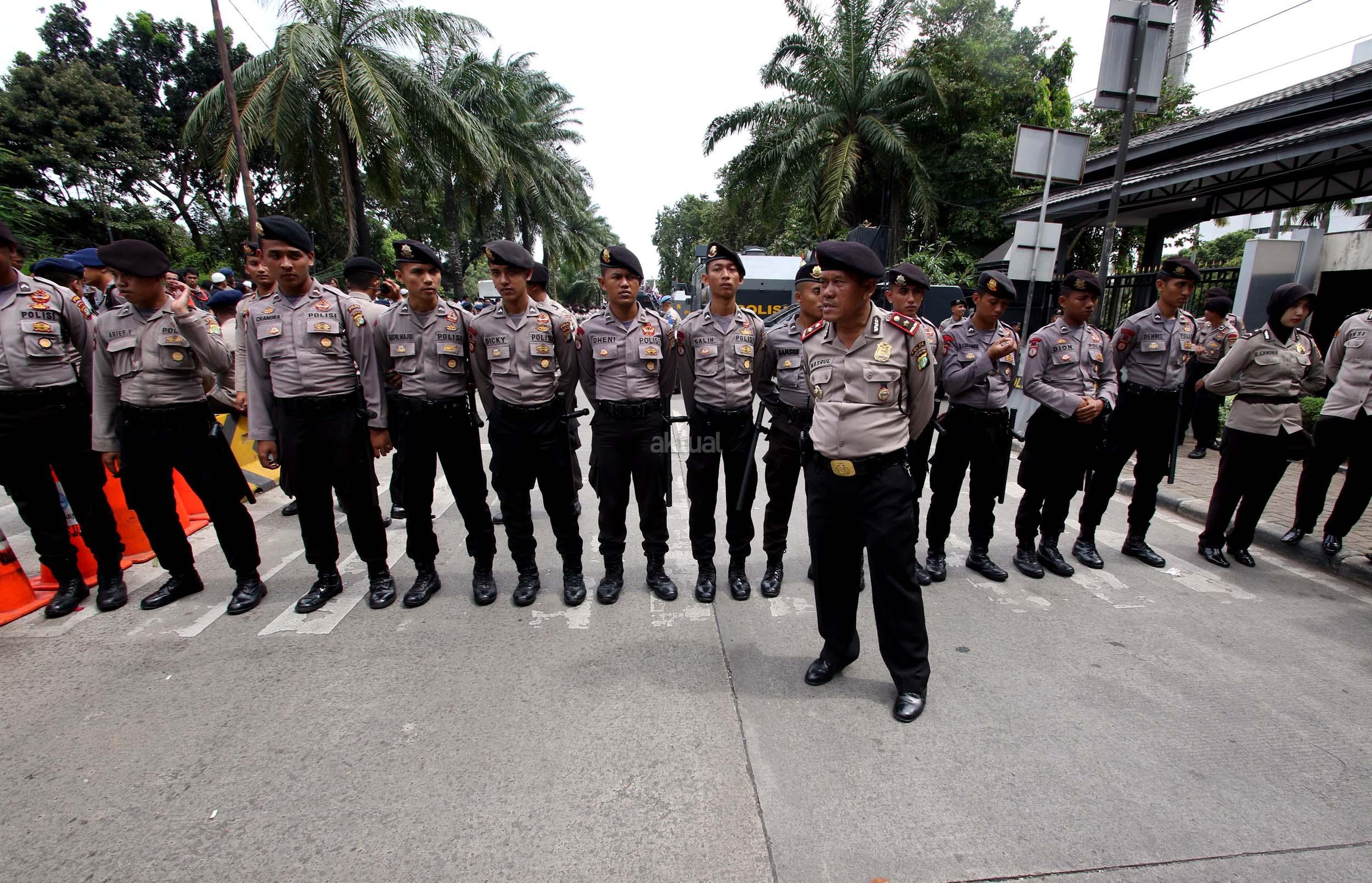 Seorang warga melintas didepan anggota Kepolisian yang sedang berjaga di lokasi sidang lanjutan Basuki Tjahaja Purnama (Ahok) di Gedung Kementerian Pertanian, Jakarta, Selasa (3/1/2017). Sedikitnya 2.500 personel kepolisian mengamankan jalannya sidang keempat tersebut. AKTUAL/Munzir