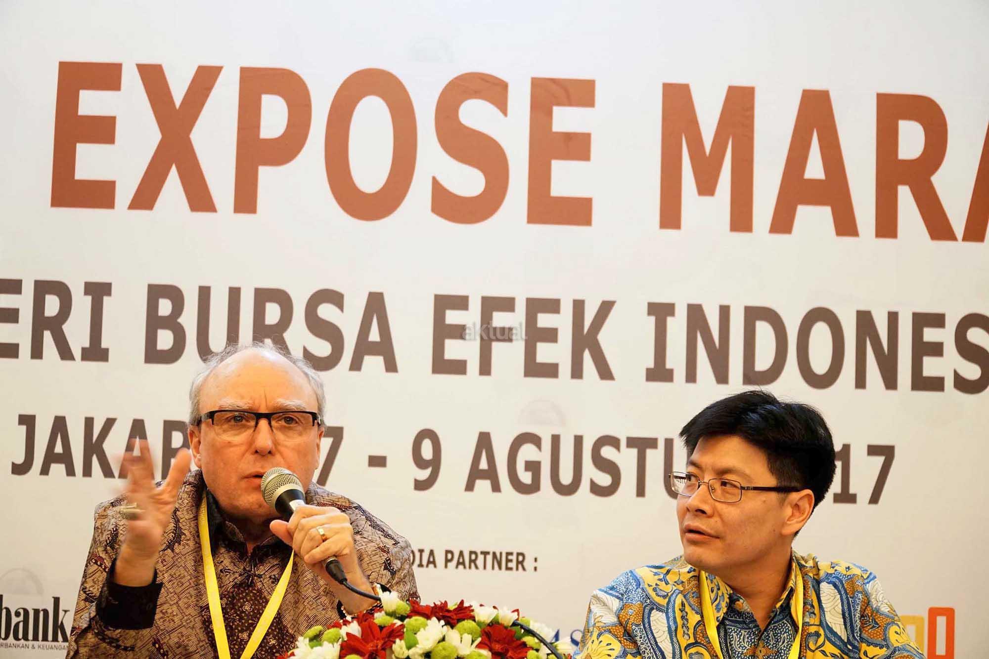 Wakil Presiden Direktur PT Bank Central Asia Tbk, Eugene K Galbraith (kiri) didampingi Head Of Investor Relations BCA, Rudy Budiardjo (kanan) saat publik Ekspose marathon di Jakarta, Selasa (9/8).BCA mencapai hasil kinerja yang positif pada semester I 2017 berkat upaya berkesinambungan dalam memperkuat perbankan transaksi dan kemampuan beradaptasi terhadap kondisi pasar terkini. Untuk menstimulasi permintaan kredit, BCA menawarkan program produk kredit konsumer dengan tingkat suku bunga yang kompetitif, serta aktif melakukan pemasaran melalui berbagai event promosi yang diselenggarakan di berbagai kota besar di Indonesia. Langkah ini mendapat respon positif dari para nasabah.Outstanding portofolio kredit tercatat sebesar Rp 433 triliun pada akhir Juni 2017, naik 11,9% YoY, didorong oleh penyaluran kredit korporasi dan konsumer. Kredit korporasi BCA tumbuh 18,7% YoY menjadi Rp 160,7 triliun sejalan dengan permintaan kredit yang meningkat pada periode April – Juni 2017. Total kredit konsumer mencatat pertumbuhan sebesar 18,4% YoY menjadi Rp 124,5 triliun. Pada portofolio kredit konsumer, kredit pemilikan rumah tumbuh 21,9% YoY menjadi Rp 75,3 triliun. Sementara itu, kredit kendaraan bermotor meningkat 12,2% YoY mencapai Rp 38,2 triliun dan outstanding kartu kredit meningkat 18,0% YoY menjadi Rp 11,1 triliun pada akhir Juni 2017. Kredit komersial dan Usaha Kecil & Menengah (UKM) tumbuh 1,2% YoY menjadi Rp 148,3 triliun, sejalan dengan adanya pelunasan fasilitas modal kerja pada semester I 2017. AKTUAL/Eko S Hilman