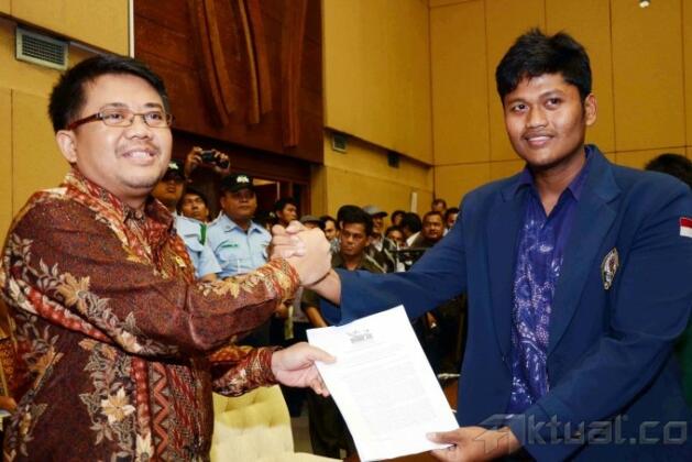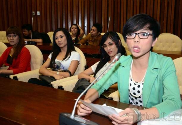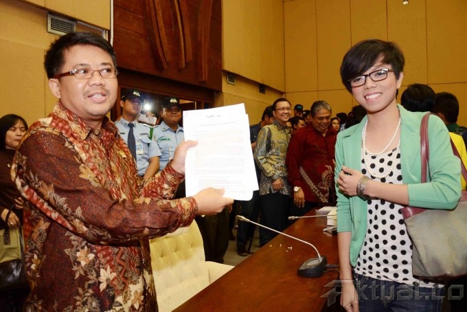 Perwakilan dari Aliansi Waria Anti Korupsi (AWAK) Devina (kanan) menyerahkan penyataan sikap kepada Pimpinan Rapat Timwas Century yang juga Wakil Ketua DPR Sohibul Iman (kiri) di ruang rapat Timwas Century, Gedung DPR, Jakarta, Rabu (29/5). Mereka meminta DPR agar mendesak KPK agar segera menuntaskan skandal Bank Century sebelum pemilu 2014. Aktual/Tino Oktaviano