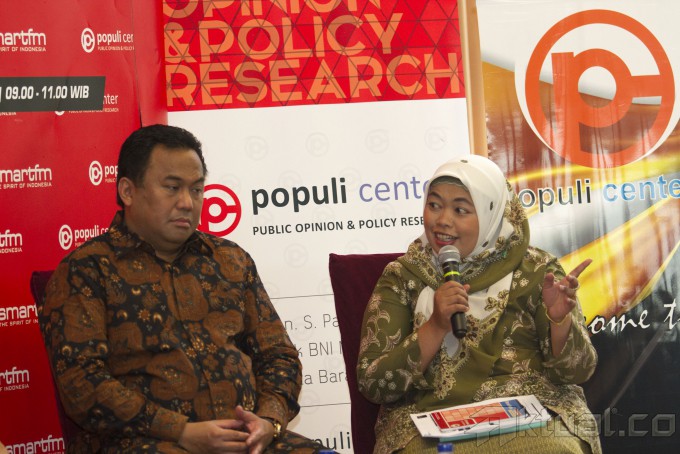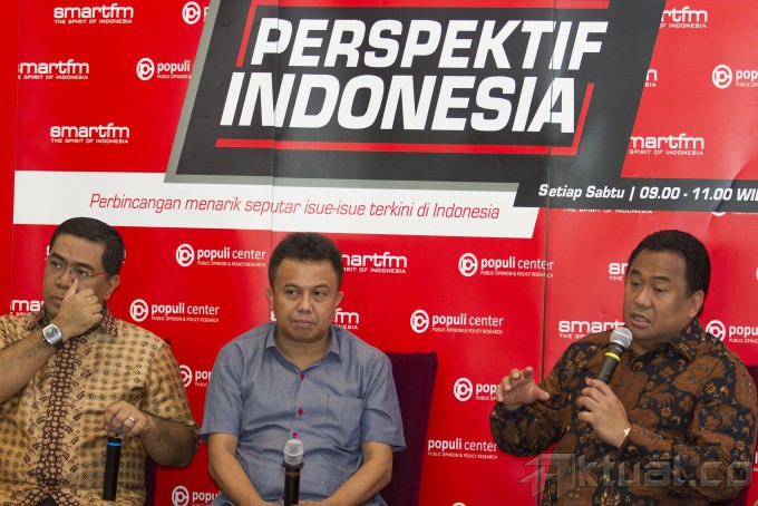 Menteri Perdagangan Rahmat Gobel (kanan) bersama Wakil Ketua Umum Kadin Yugi Prayanto (kiri) dan Pembawa Acara Ichan Loulembah (tengah) menjadi pembicara pada diskusi Perspektif Indonesia di Jakarta, Sabtu (16/5). Diskusi Perspektif indonesia membahas perihal surutnya kinerja ekonomi-politik Kabinet Kerja. ANTARA FOTO/Vitalis Yogi Trisna