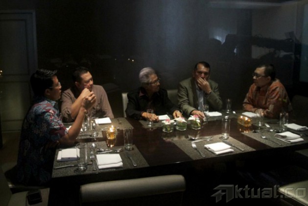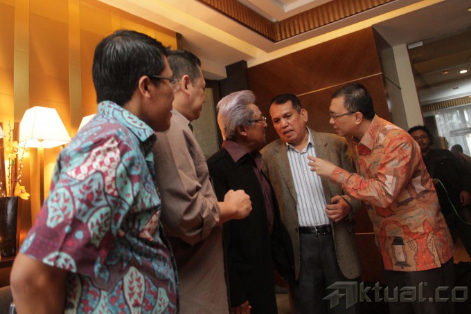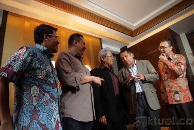 Penggagas Pansus Century yang tergabung dalam Tim 9 dari kiri : Misbakhun, Bambang Soesatyo, Chairumman Harahap, dan Chandra Tirta Widjaja berbincang dengan pakar hukum Adnan Buyung Nasution (dua kanan) usai konferensi pers Roadshow Timwas Century di Jakarta, Jumat (24/1/2014). Dalam roadshow tersebut Tim 9 mengajak serta mencari dukungan dari berbagai tokoh masyarakat serta rakyat mendorong agar Wapres Boediono mau hadir dan memberikan keterangan terkait dugaan keterlibatan Boediono dalam kapasitas sebagai Gubernur Bank Indonesia pada kasus dana talangan Bank Century. Aktual/Tino Oktaviano