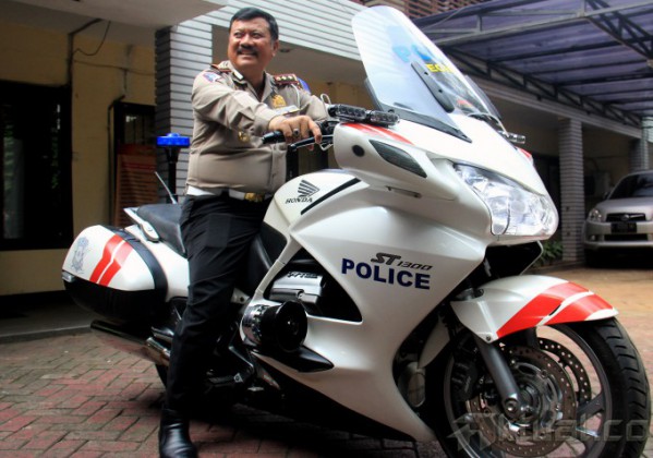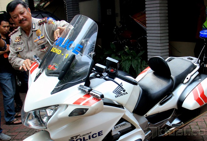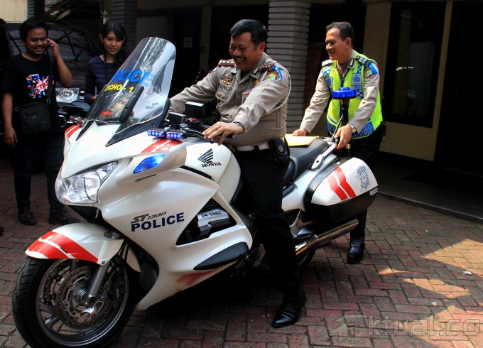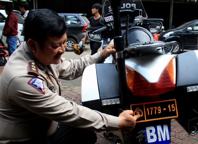 Kasat Lantas Polres Jakarta Barat AKBP Ipung Purnomo menunjukan plat bodong motor moge di Unit Ranmor Polda Metor Jaya, Jakarta, Selasa (2/6/2015). Penyelidikan polisi terhadap Rocky Herdarmel (37), yang bergaya bak polisi menerobos busway terus berlanjut. Setelah diketahui moge Honda XP 1.300 CC mirip Satuan Lalu Lintas (Satlantas) Polri ini tidak memiliki surat-surat. AKTUAL/MUNZIR