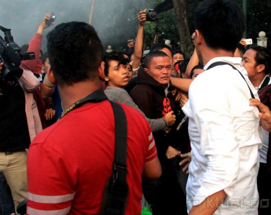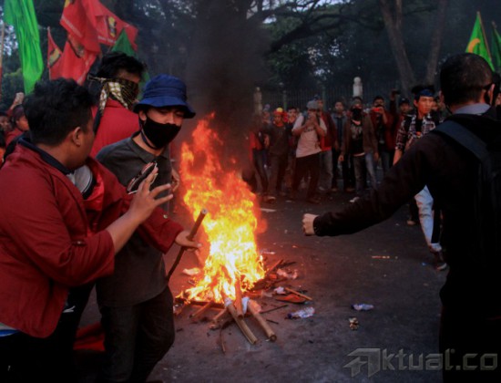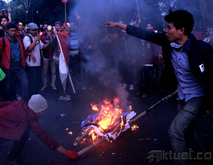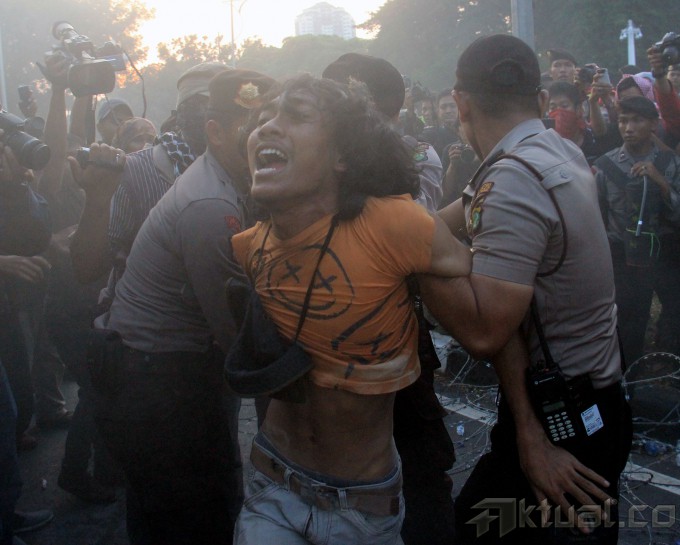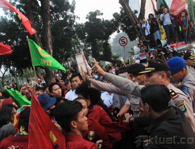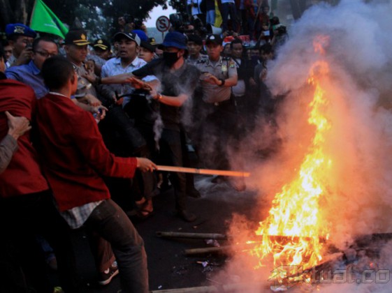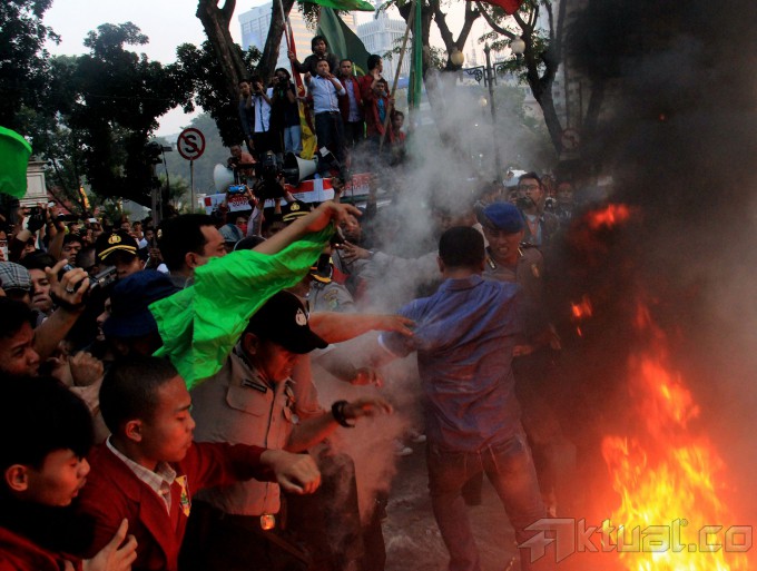 Beberapa anggota polisi berusaha menangkap mahasiswa yang membakar ban, poster dan spanduk saat berunjuk rasa di depan Istana Merdeka, Jakarta, Kamis (21/5/2015). Aksi mahasiswa menuntut Jokowi-JK turun sempat bentrok dengan polisi dan mengakibatkan beberapa anggota mahasiswa IMM ditangkap. AKTUAL/MUNZIR