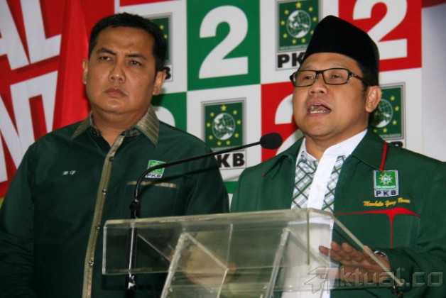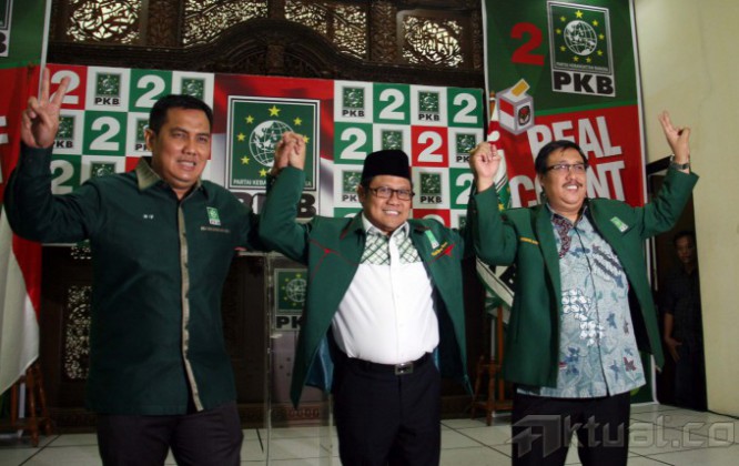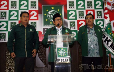 Ketua Umum Partai Kebangkitan Bangsa (PKB) Muhaimin Iskandar alias Cak Imin (tengah) bersama Ketua DPP PKB Faishal Zaini (kiri), Pengurus DPP PKB Bambang Susanto saat menggelar jumpa pers di Kantor DPP PKB, Jalan Raden Saleh, Jakarta, Kamis (10/4/2014). PKB semakin percaya diri pasca-keluarnya hasil hitung cepat pemilu legislatif yang menempatkan partai pimpinan Muhaimin Iskandar itu mengalami kenaikan signifikan dan mampu menyodok ke posisi lima besar. Karenanya, PKB justru siap menggalang poros koalisi baru di pemilu presiden (pilpres) nanti.Aktual/Tino Oktaviano